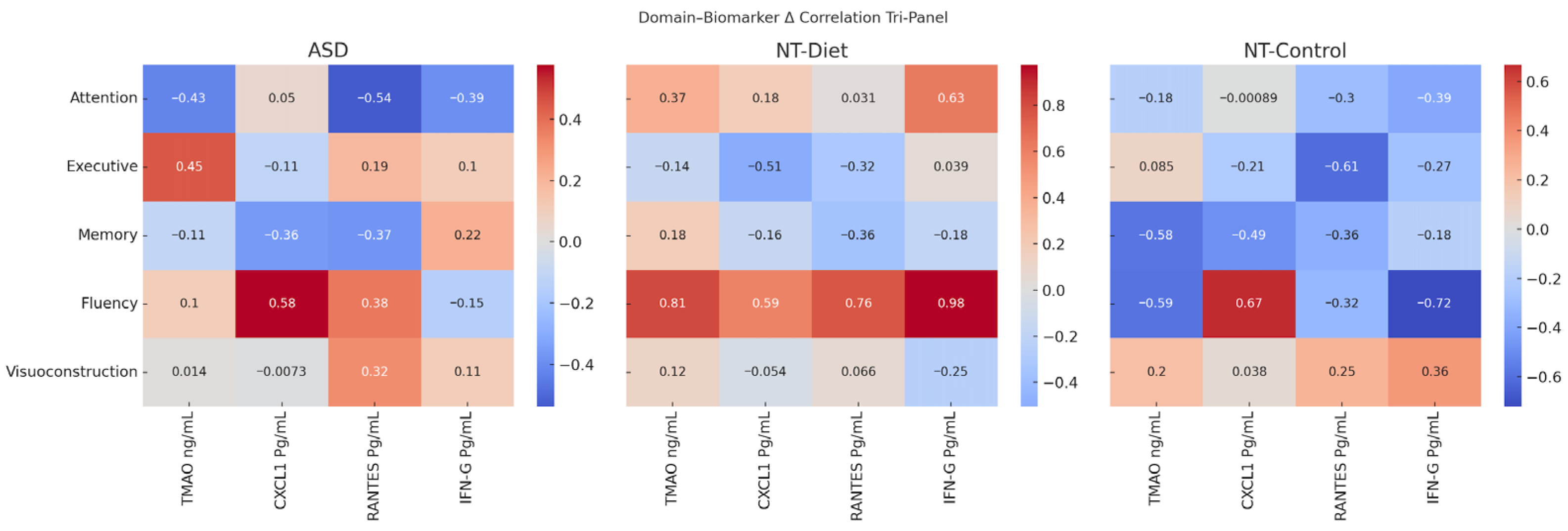 Figure 8 presents a tri-panel heatmap illustrating the correlation matrices between domain-level cognitive changes and biomarker changes separately for the ASD, NT-Diet, and NT-Control groups.