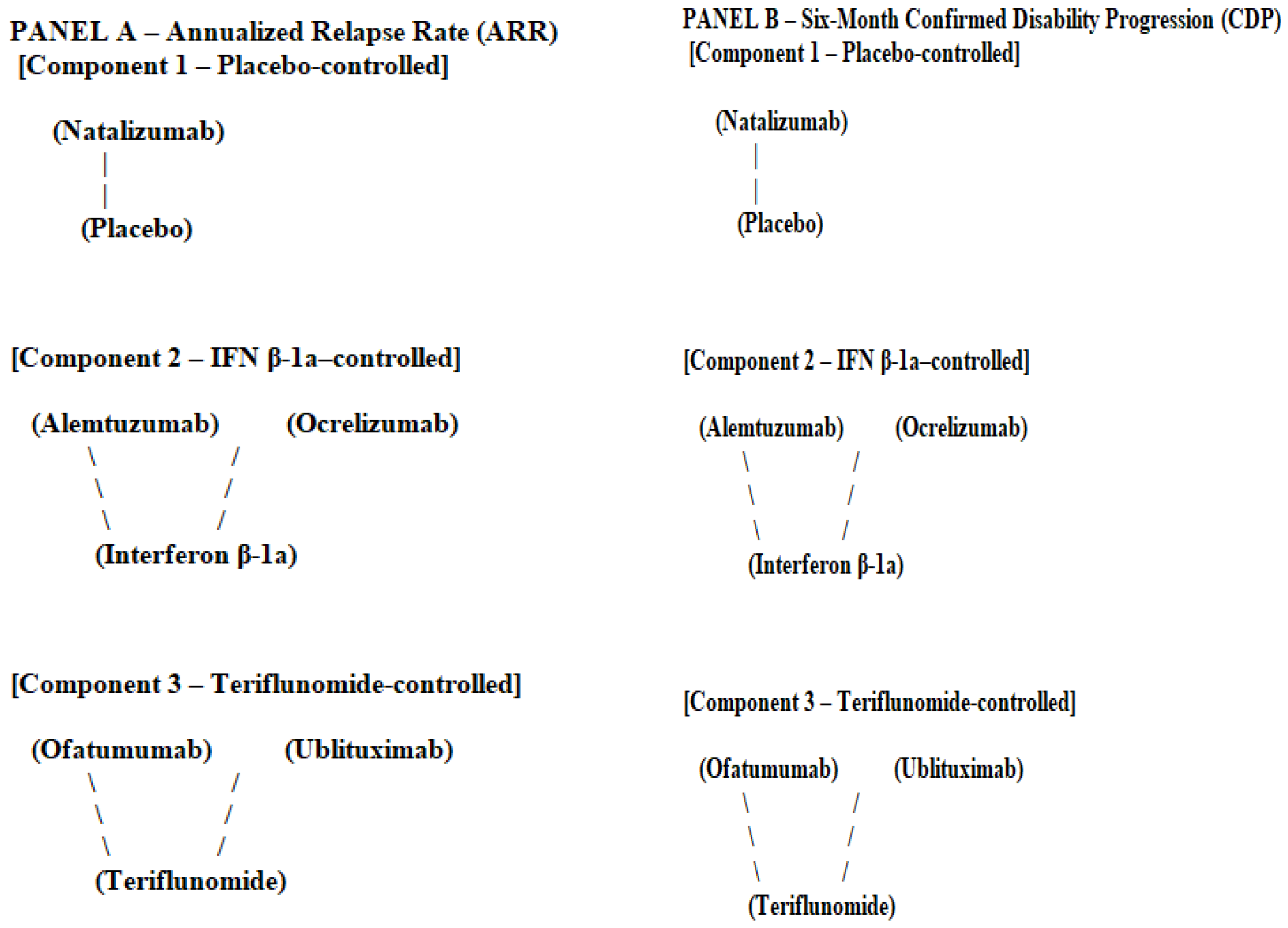 For ARR, the evidence base is fragmented into three disconnected comparator-defined components: a placebo-controlled component including natalizumab, an interferon beta-1a-controlled component including alemtuzumab and ocrelizumab, and a teriflunomide-controlled component including ofatumumab and ublituximab. No randomized links exist between these components, precluding indirect inference across comparator eras.