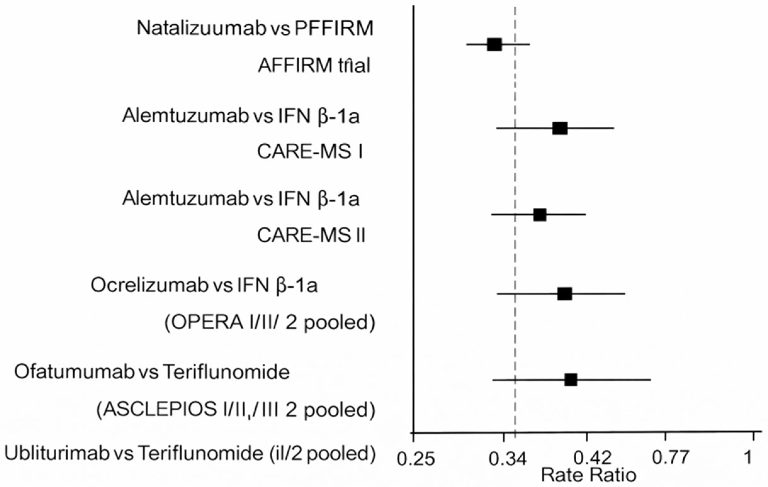 Within the interferon beta-1a component, some heterogeneity is present. The CARE-MS I trial enrolled exclusively treatment-naïve patients with short disease duration and high relapse activity, whereas CARE-MS II enrolled patients with a prior inadequate response to disease-modifying therapy. The OPERA trials enrolled a mixed population, with approximately 40% previously treated. Baseline EDSS and disease duration were slightly higher in OPERA than in CARE-MS I, but comparable to CARE-MS II. Despite these differences, all four trials enrolled patients with active relapsing MS and demonstrated consistent, large-magnitude treatment effects on relapse rate. For disability progression, treatment effects were also directionally consistent and of similar magnitude across trials. Therefore, while the populations are not identical, the consistency of effect sizes across these heterogeneous subgroups supports the interpretation that both alemtuzumab and ocrelizumab are highly effective relative to interferon beta-1a, and that qualitative comparison of their effect estimates is reasonable.
