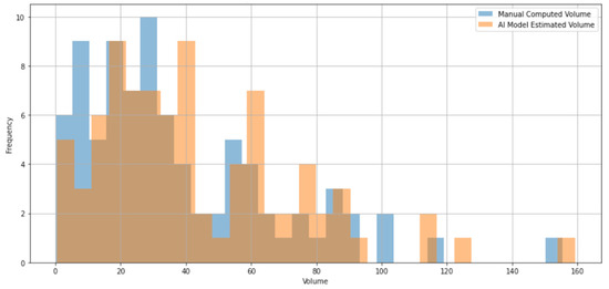 Comparison of volume distributions: manual computed tumoral volume vs. AI model estimated tumoral volume.