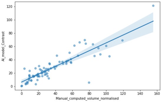 Scatter plot of manual computed volume normalized vs. AI model contrast tumoral volume estimated and their correlation.