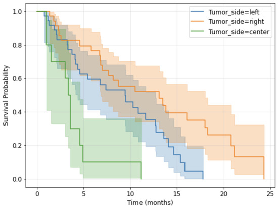 The survival outcomes were stratified by tumor laterality (left, center, right), as detailed in Table 3. The statistical tests (Cox Regression Results, left vs. center HR = 0.32822, p value = 0.00369, right vs. center HR = 0.16140, p value = 0.00001) indicated a significant difference in median survival between tumor sides, central tumors being the most aggressive (Figure 4).
