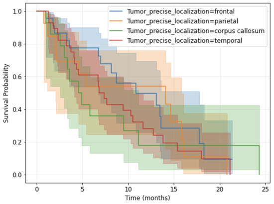 The Kaplan–Meier survival curves for the overall study population stratified by sex are presented in Figure 5, while the ones stratified according to the precise tumor localization are shown in Figure 6. The median overall survival for the cohort was 8.16 months (95%, confidence interval 2.3–14.63).