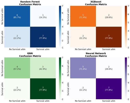 For binary prediction of survival ≥ 6 months we compared Random Forest Classifier (n_estimators = 100, max_depth = 2; class_weight = ‘balanced’), XGBoost Classifier (n_estimators = 100, max_depth = 1; scale_pos_weight = class_ratio), k-Nearest Neighbors Classifier (n_neighbors = 3, weights = ‘distance’), and a Neural Network (sequential model with a hidden layer of 8 neurons) trained with class weights. The same train/test split strategy described above was used. The class ratio split was used in training to adapt to the imbalance. Classification performance metrics included accuracy, precision, recall, F1 score and area under the ROC curve (AUC). Confusion matrices were reported to illustrate the trade-off between sensitivity and specificity.