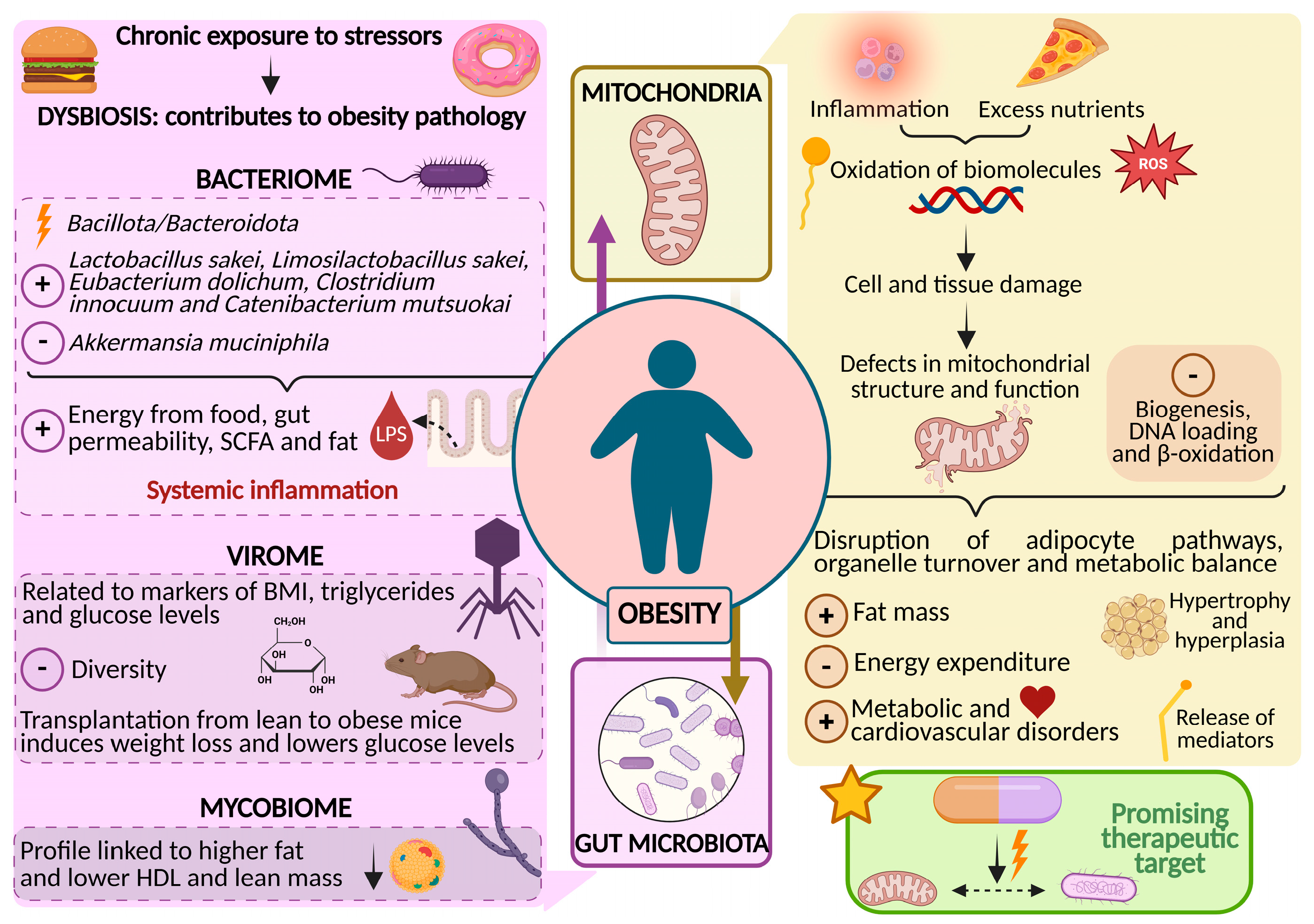 The diagram illustrates key mitochondrial alterations (impaired bioenergetics, oxidative stress, defective biogenesis and dynamics, and mitochondrial DNA damage) together with shifts in the gut microbiota, including changes in the bacteriome, virome, and mycobiome. It also depicts the bidirectional interactions between these systems and their modulation by diet. These interconnected alterations contribute to inflammation, metabolic dysfunction, and adipose tissue expansion, highlighting the microbiota–mitochondria axis as a relevant target for future therapeutic strategies in obesity.
