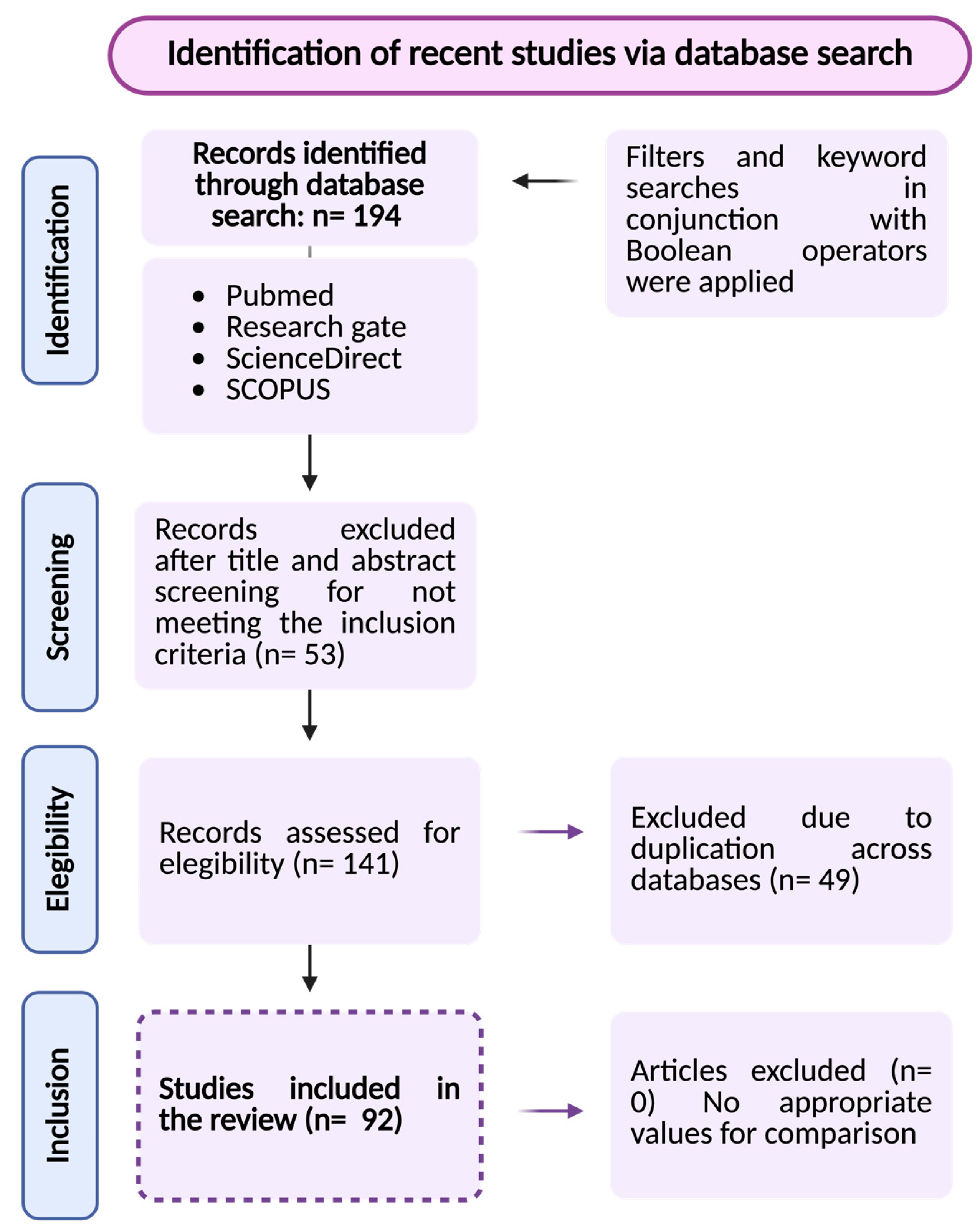 A total of 194 entries were initially identified through the database searches considering the predefined inclusion and exclusion criteria. Then, 53 records were excluded after title and abstract screening and 141 studies were included in the final analysis, encompassing both preclinical and clinical research. Subsequently, 49 duplicates were excluded. After thoroughly reviewing the titles and abstracts of the remaining articles, 92 were deemed potentially relevant for inclusion in this review (