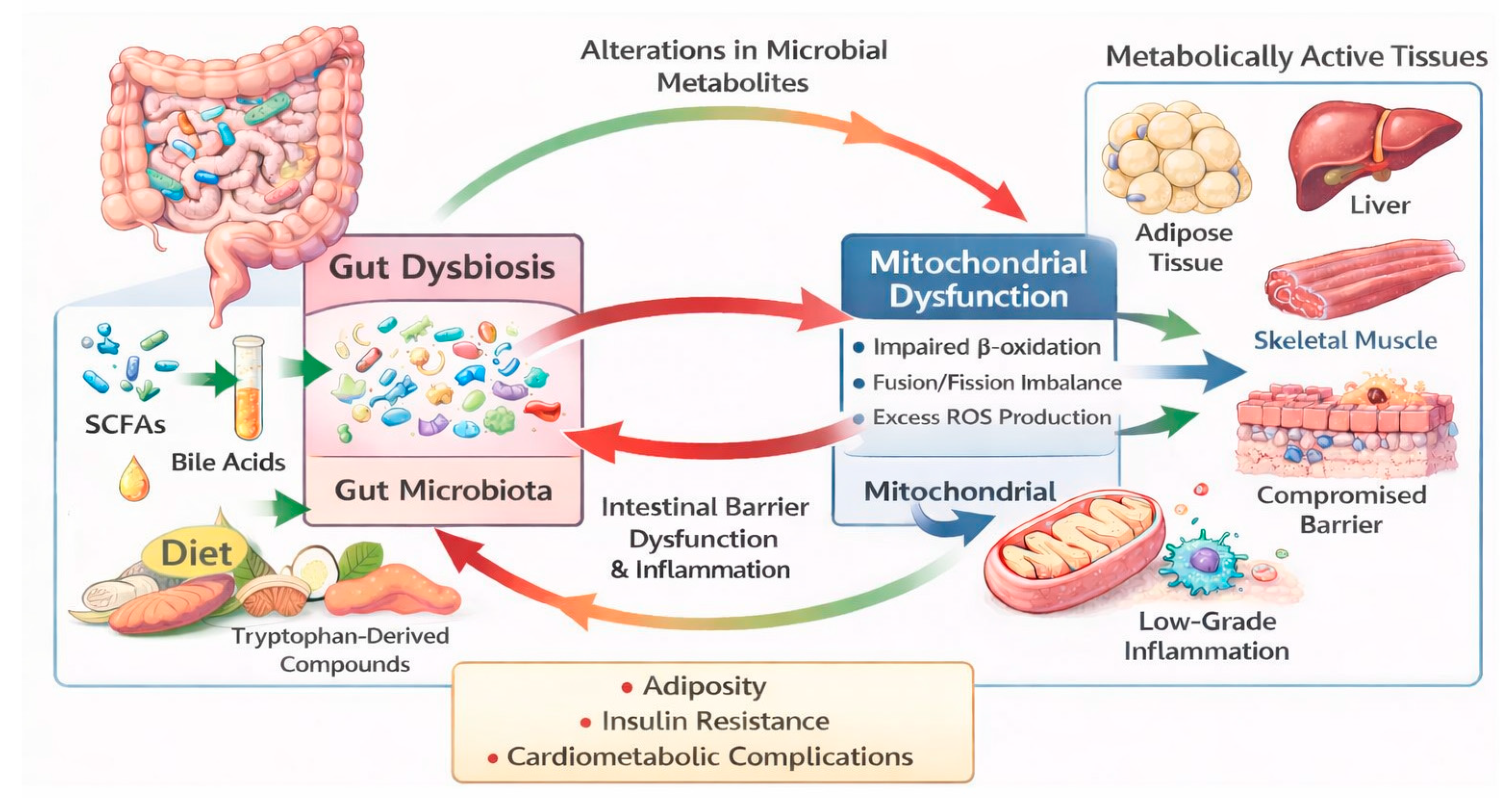 In this context, the present scoping review aims to analyse the connection between the gut microbiome and mitochondria, with particular emphasis on the underlying molecular mechanisms and their potential as therapeutic targets. Additionally, it examines current and future strategies to modulate this axis through postbiotics, probiotics, prebiotics, and other innovative approaches, with the goal of contributing to the development of more effective and personalised long-term management strategies for obesity and its comorbidities.