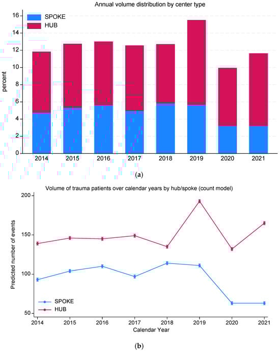 | Variable | N (%) | IRR (95%CI) vs. Previous | p-Value * | Interaction of Year and Centre p-Value | Spoke N (%) | p-Value | Hub N (%) | p-Value * |