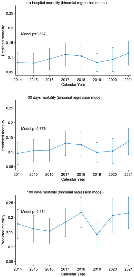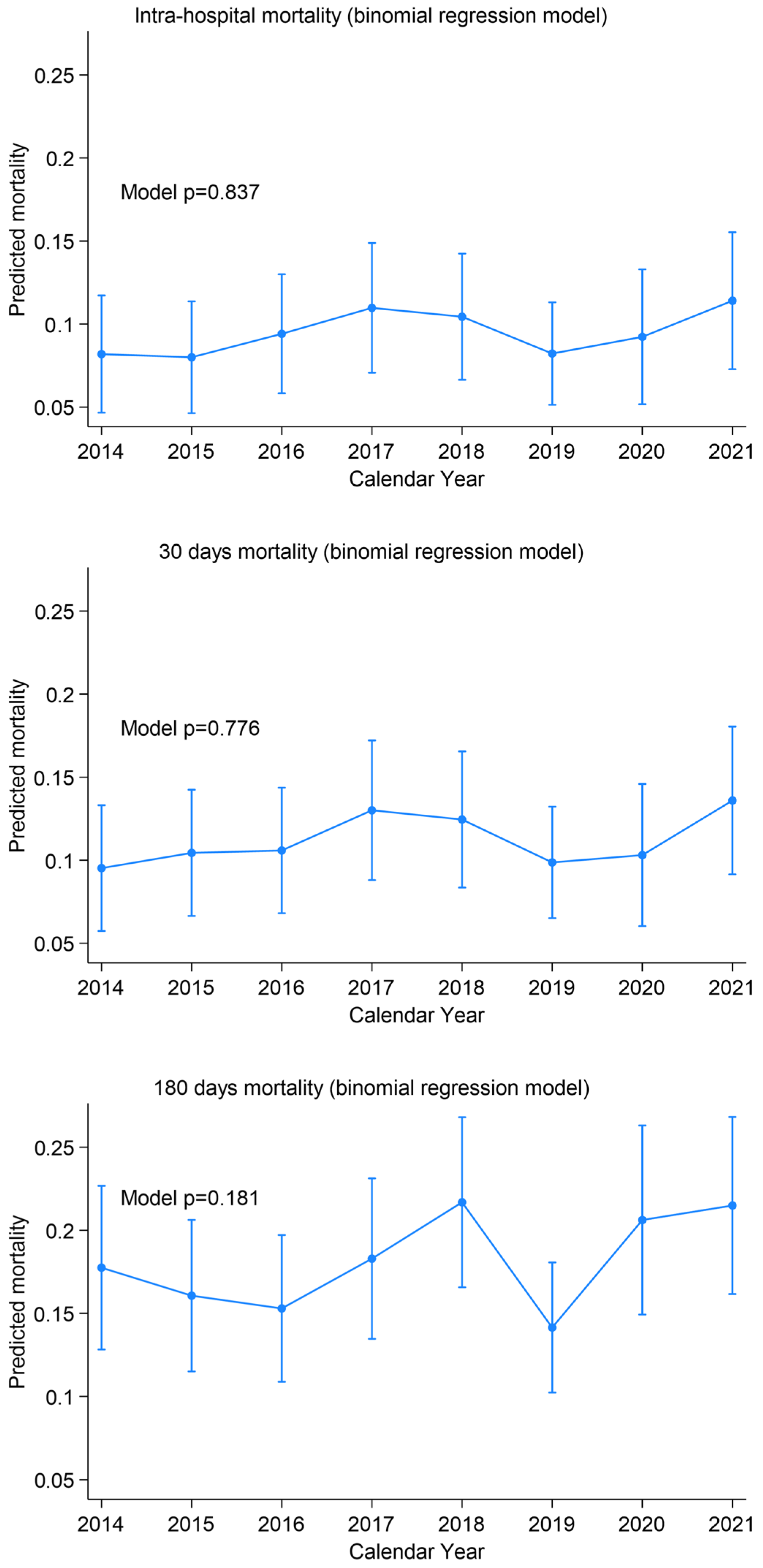 - Mortality (in-hospital, 30-day, and 180-day) showed no significant trends, confirming that increased centralization and stable patient volumes did not compromise overall outcomes, but rather maintained high-quality care.