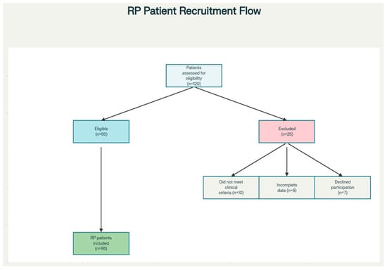The inclusion criteria were established to ensure a homogeneous study population while maintaining broad representativeness. Patients were required to have a confirmed clinical diagnosis of RP based on characteristic fundoscopic findings, including bone spicule pigmentation, arteriolar narrowing, and waxy pallor of the optic disc, along with supporting electroretinography findings demonstrating reduced or absent rod responses. Additionally, patients needed to demonstrate progressive visual field loss consistent with RP progression patterns. Exclusion criteria included patients with secondary retinal dystrophies due to inflammatory, infectious, or toxic causes, as well as those with incomplete clinical data that would prevent meaningful analysis.
