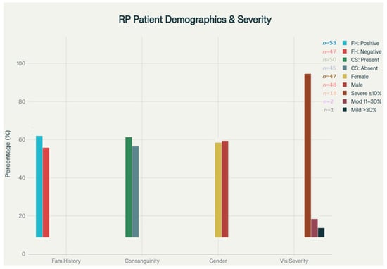 Severity of vision loss was classified according to best-corrected visual acuity (BCVA) recorded at the most recent clinic visit. In this study, disease severity was classified using a simplified approach based on best-corrected visual acuity consistent with conventional clinical reporting. Visual acuity severity was classified using established clinical criteria adapted for this study population. Severe vision loss was defined as visual acuity of 10% or less, representing significant functional impairment that substantially affects daily activities and mobility [19]. Moderate vision loss encompassed visual acuity between 11% and 30%, indicating considerable visual impairment but with retention of some useful vision for navigation and close work. Mild vision loss was defined as visual acuity greater than 30%, representing early to intermediate disease stages where patients maintain substantial functional vision despite measurable impairment. Our simplified methodology was chosen for pragmatic applicability to retrospective datasets and consistency with prior published RP cohorts.