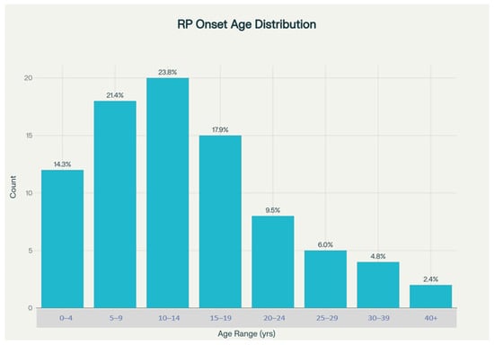 The temporal patterns of symptom onset provide crucial insights into the natural history of RP in this population. Symptom onset age data were available for 84 patients, representing 88.4% of the total cohort, which provides a robust foundation for analyzing disease onset patterns. The mean age of symptom onset was calculated at 14.8 ± 11.1 years, with a remarkably wide range extending from birth (age 0) to 52 years, highlighting the substantial heterogeneity in disease presentation timing that likely reflects underlying genetic diversity.
