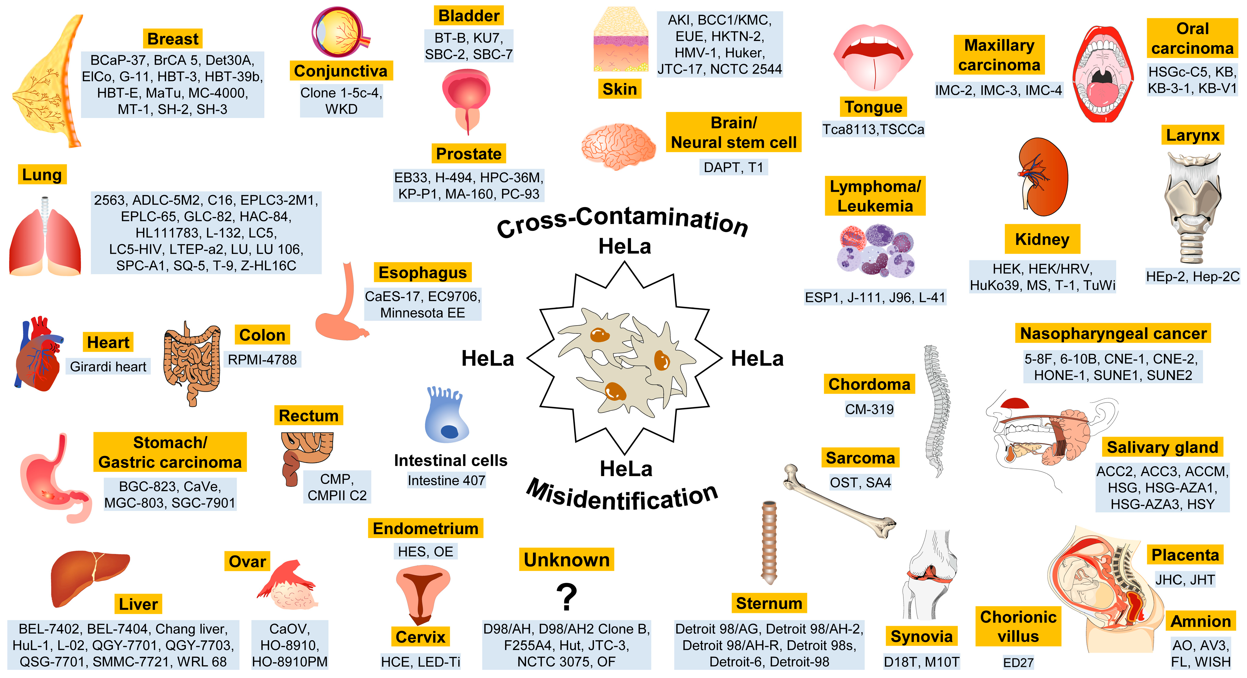 | ICLAC Registry of Misidentified Cell Lines | Curated by the International Cell Line Authentication Committee; authoritative, widely cited, and freely accessible; updated several times per year; cross-linked to Cellosaurus entries [24]. | List of cell lines shown to be misidentified or cross-contaminated; original (claimed) vs. true identity; evidence and primary literature references; ICLAC unique identifier; date of entry/update. https://iclac.org/databases/cross-contaminations/ (accessed on 4 December 2025). |