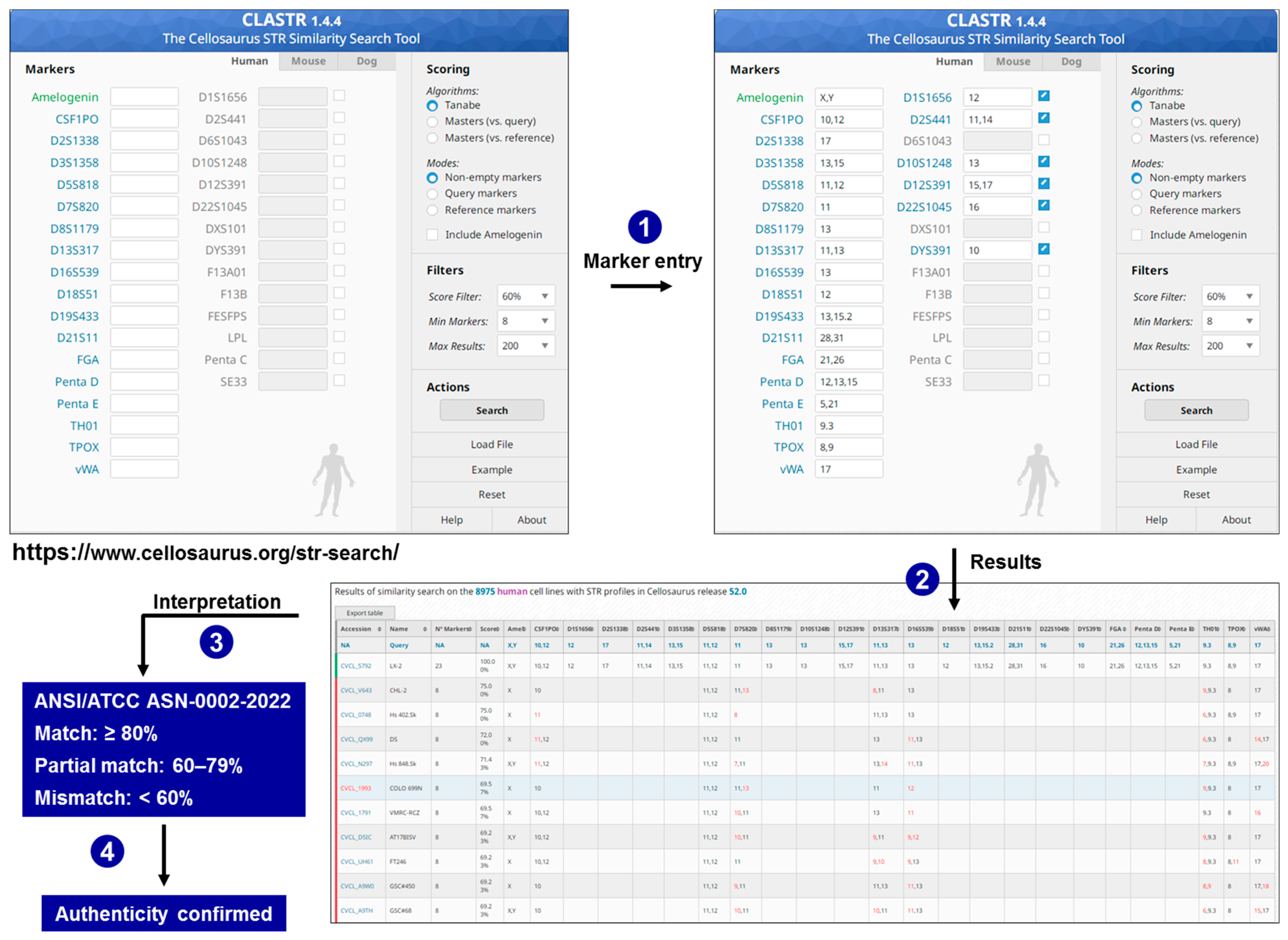 | CLASTR (Cellosaurus STR Similarity Search Tool) | Companion service to Cellosaurus; accepts user-supplied STR or microsatellite profiles to detect matches; useful for routine authentication or contamination checks [36]. | Similarity scores between the submitted STR profile and thousands of reference profiles; ranked list of best-matching cell lines; match statistics and graphical alignment; downloadable reports. https://www.cellosaurus.org/str-search/ (accessed on 4 December 2025). https://www.cellosaurus.org/ (accessed on 4 December 2025). |