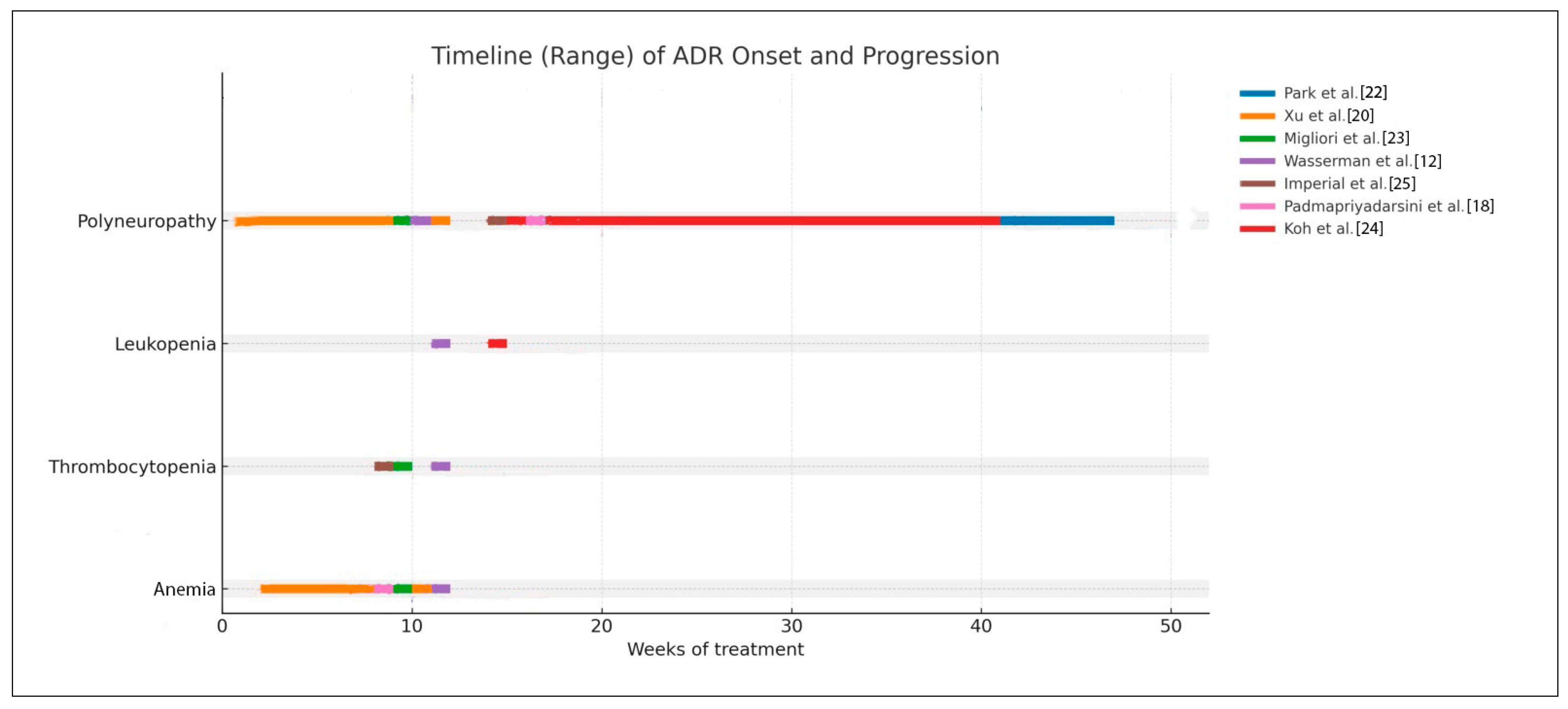 | Padmapriyadarsini et al., 2023 [18] | India/Prospective cohort | Total 165 patients all MDR-TB | 600 mg once daily | N/A | Anemia: 78 incidents | 56 days | Yes, 600 mg to 300 mg once daily | - | Yes, with hematinic support. One patient received blood transfusion. |