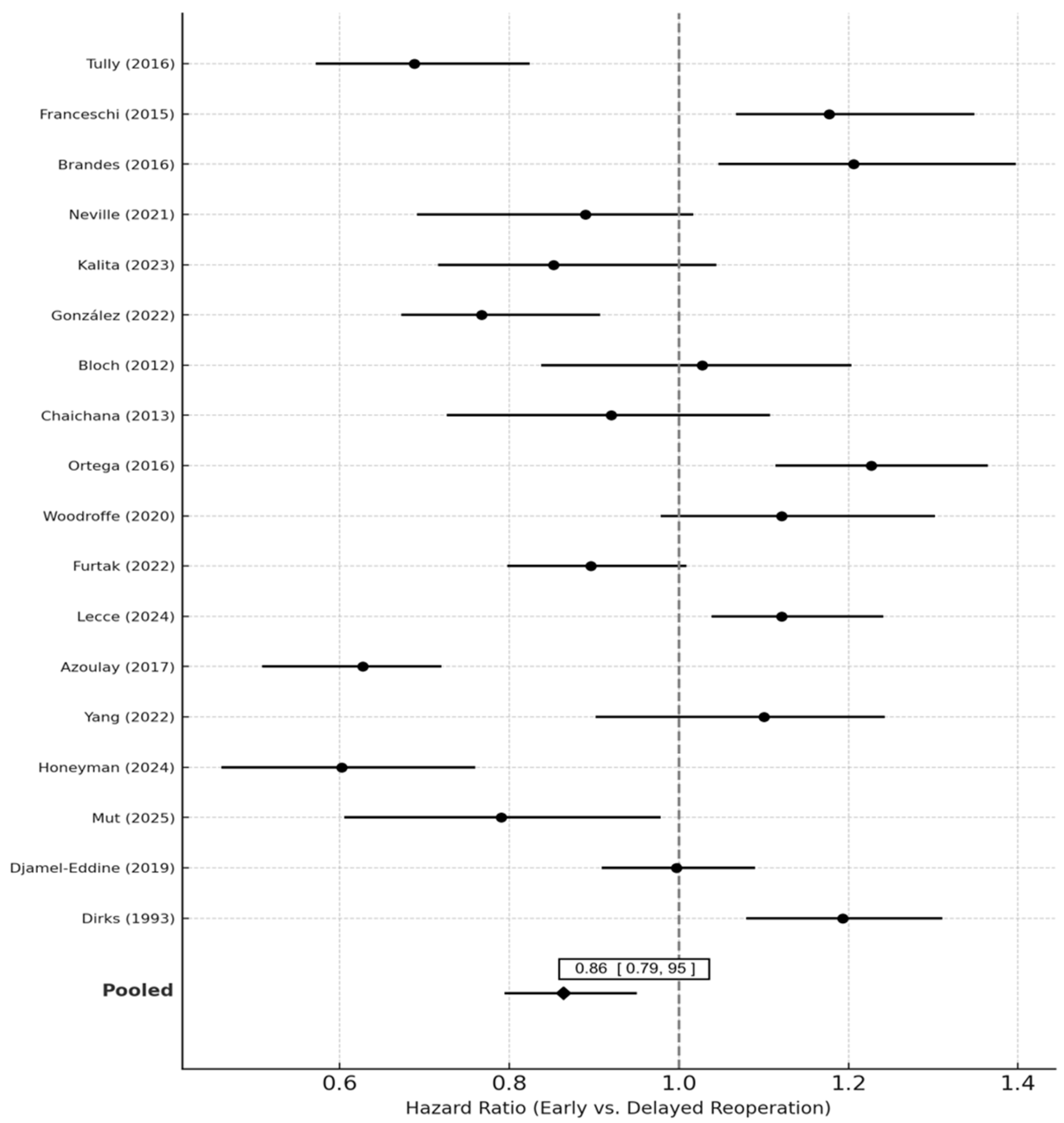 Pooled analysis of 14 studies demonstrated a significant survival benefit for early compared with delayed reoperation. The random-effects pooled hazard ratio (HR) was 0.86 (95% CI 0.77–0.95; p = 0.004), indicating a 14% relative reduction in the hazard of death associated with earlier reoperation. Heterogeneity was low to moderate (I2 = 32.4%, τ2 = 0.015, p = 0.08).