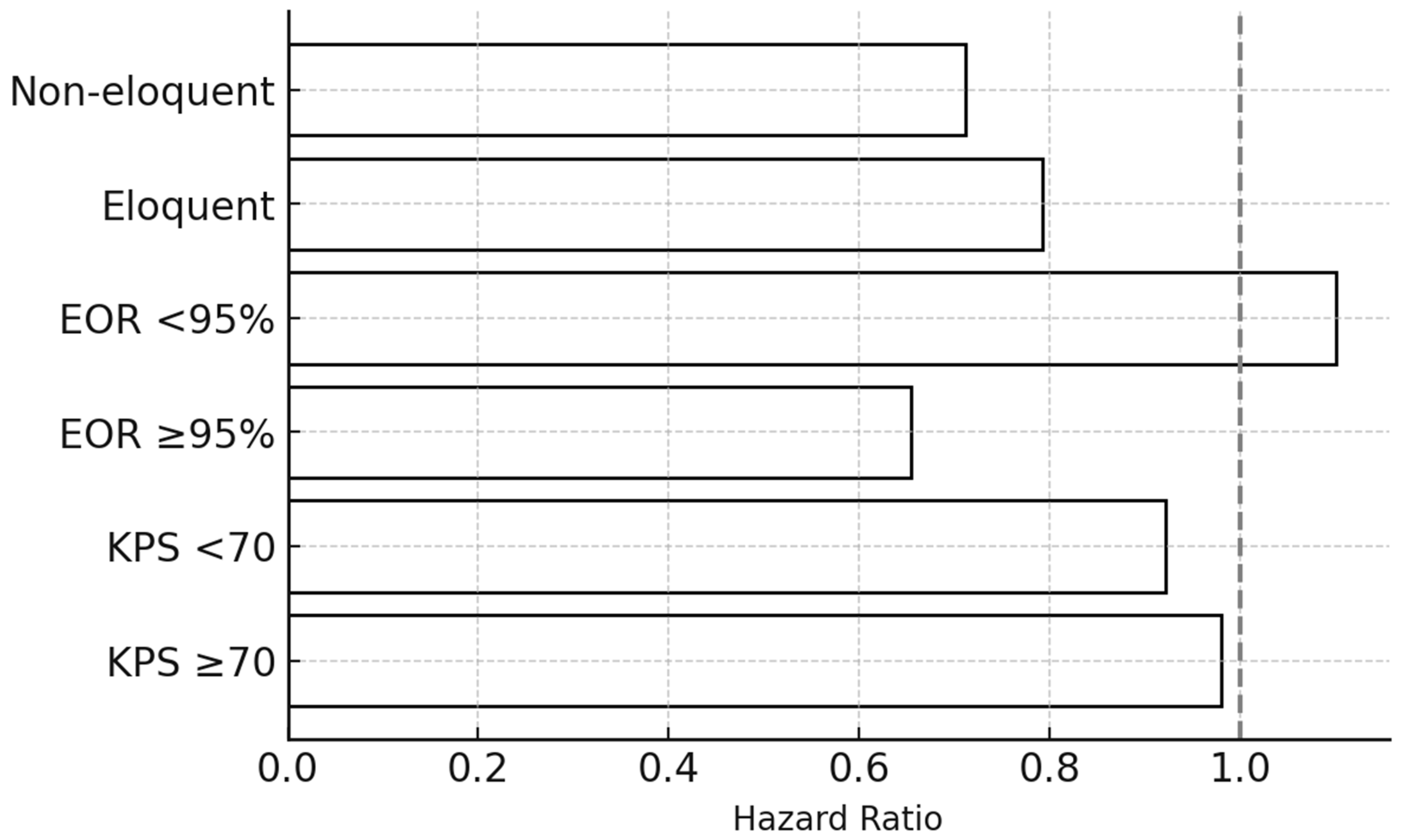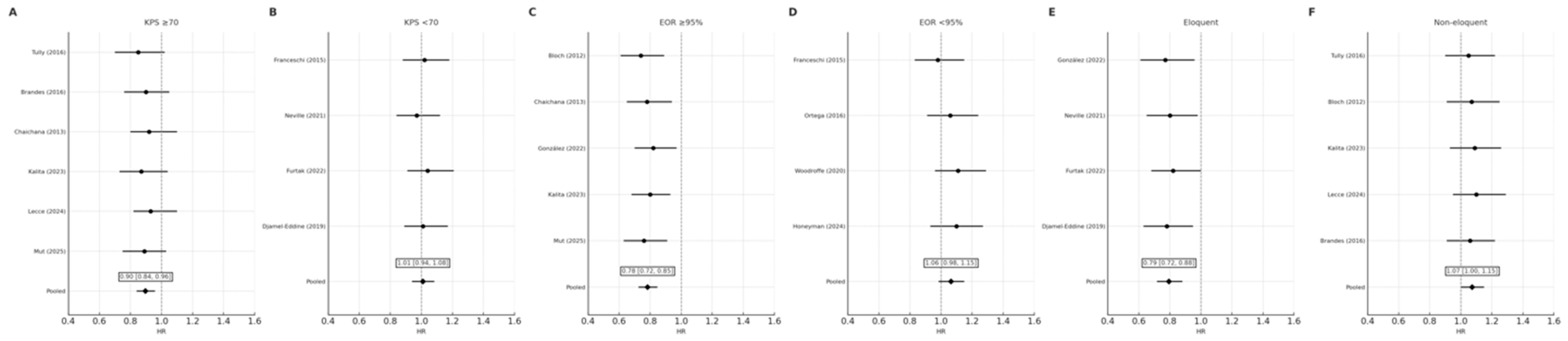 Horizontal bar chart summarizing subgroup-specific pooled HRs for overall survival, stratified by key clinical and radiological variables: (1) baseline KPS (≥70 vs. <70), (2) extent of resection (EOR ≥ 95% vs. <95%), and (3) anatomical location (eloquent vs. non-eloquent cortex).