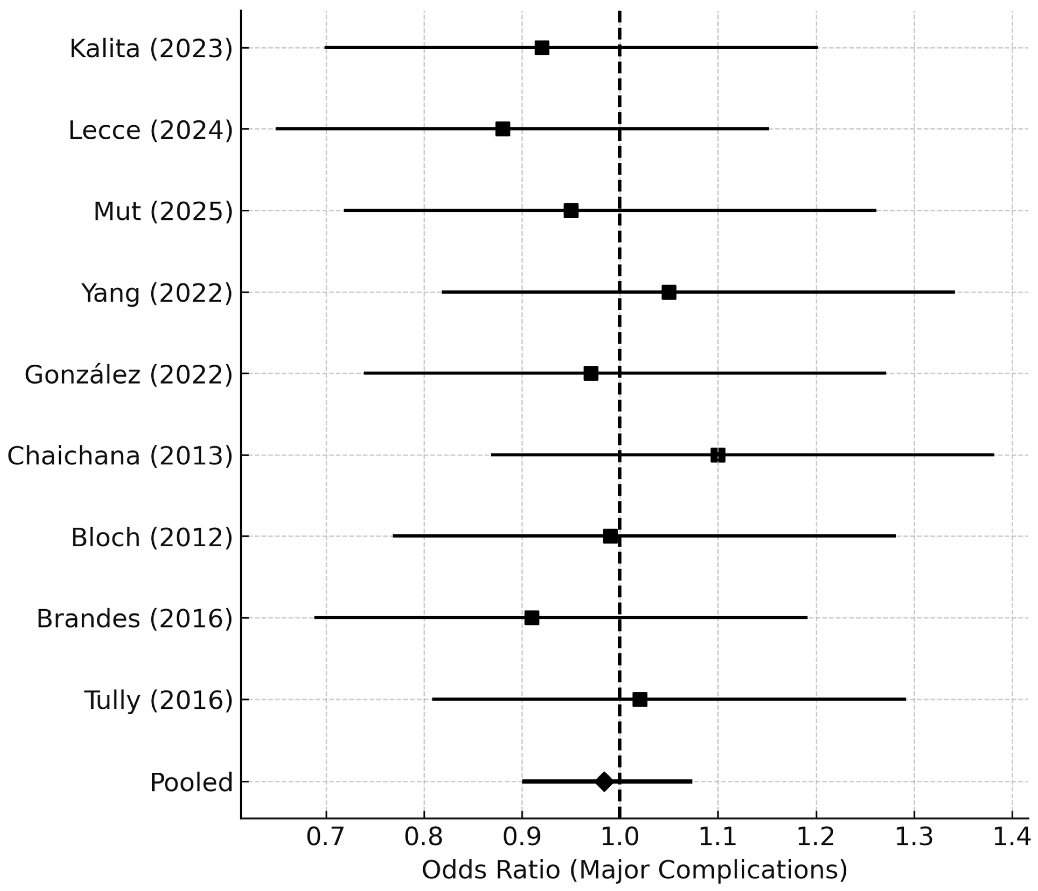 Forest plot summarizing pooled odds ratios (ORs) for major postoperative complications (Clavien–Dindo grade ≥ III or CTCAE ≥ 3) following reoperation for rGBM. Each study contributes an OR with a 95% CI for major morbidity comparing early vs. delayed reoperation. The pooled OR near 1.0 indicates no significant difference in perioperative safety between early and delayed timing groups. Horizontal lines denote CIs, and the vertical dashed line at OR = 1.0 marks the null effect.