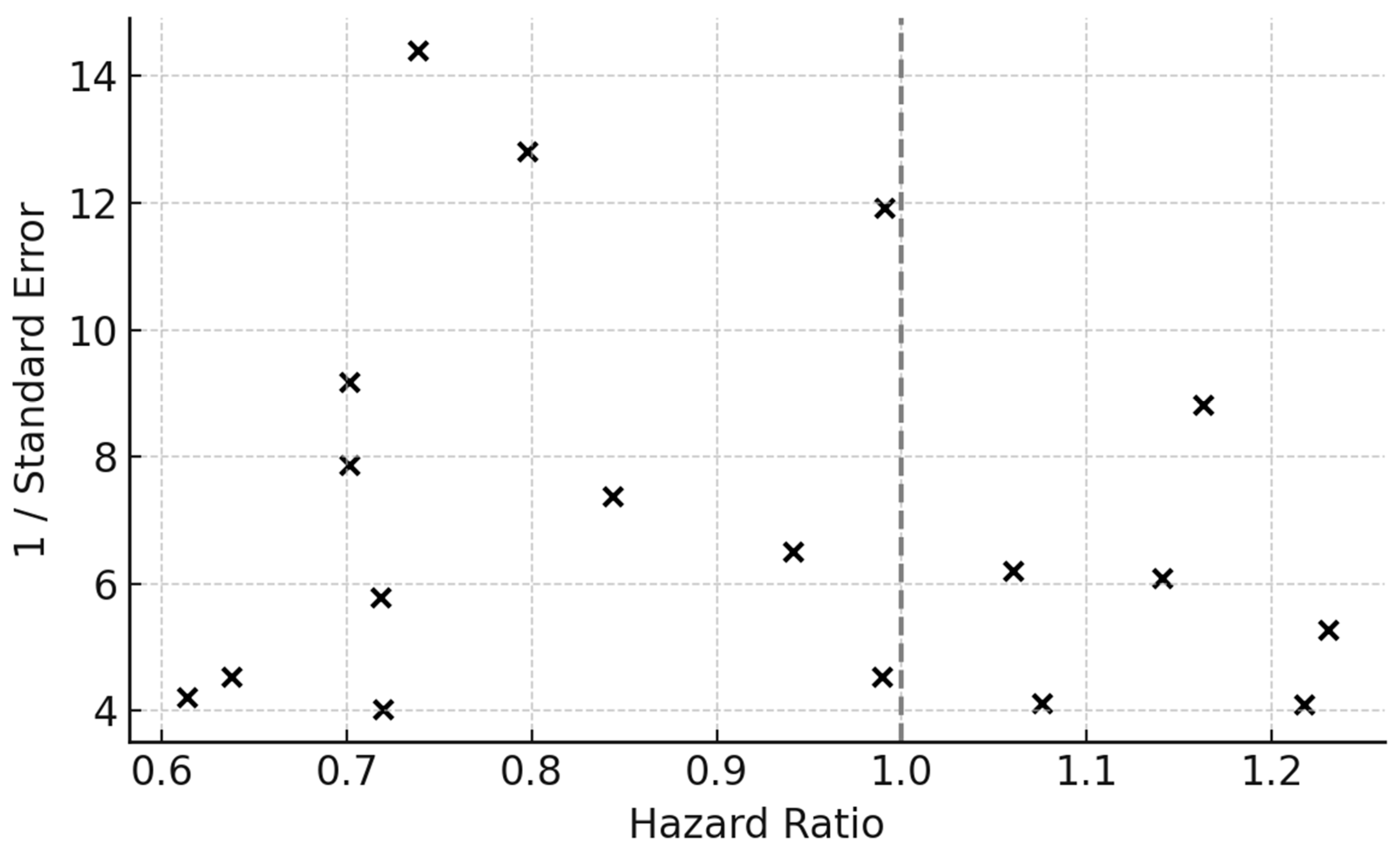 Funnel plot of individual study HRs plotted against their standard errors (SEs) to assess small-study and publication bias. The symmetrical distribution around the pooled effect estimate suggests limited evidence of publication bias. The vertical dashed line represents the pooled HR from the random-effects model, while the spread reflects sampling variability.