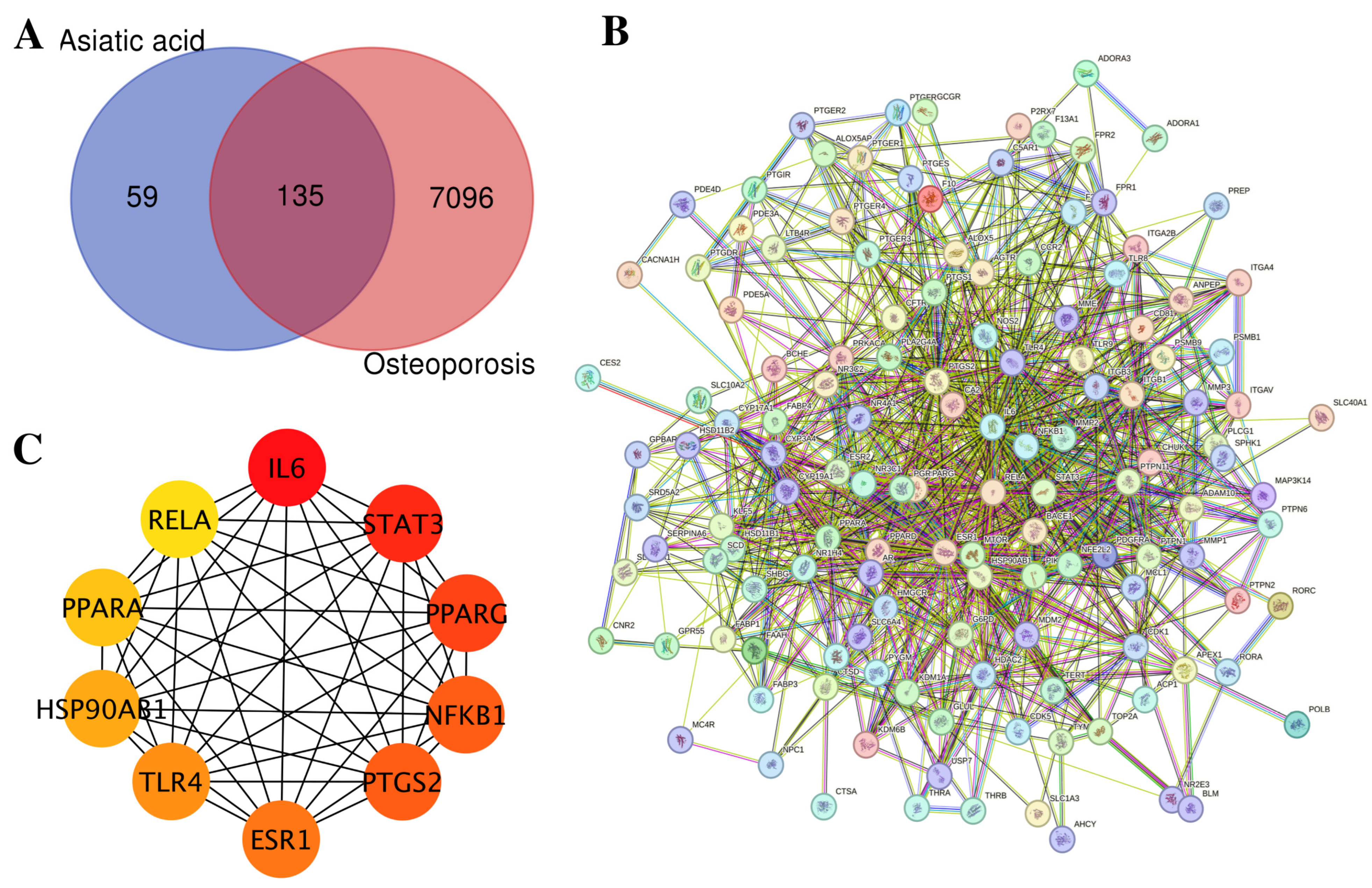 3.1. Network Pharmacology Analysis of Asiatic Acid Targets Related to Osteoporosis
