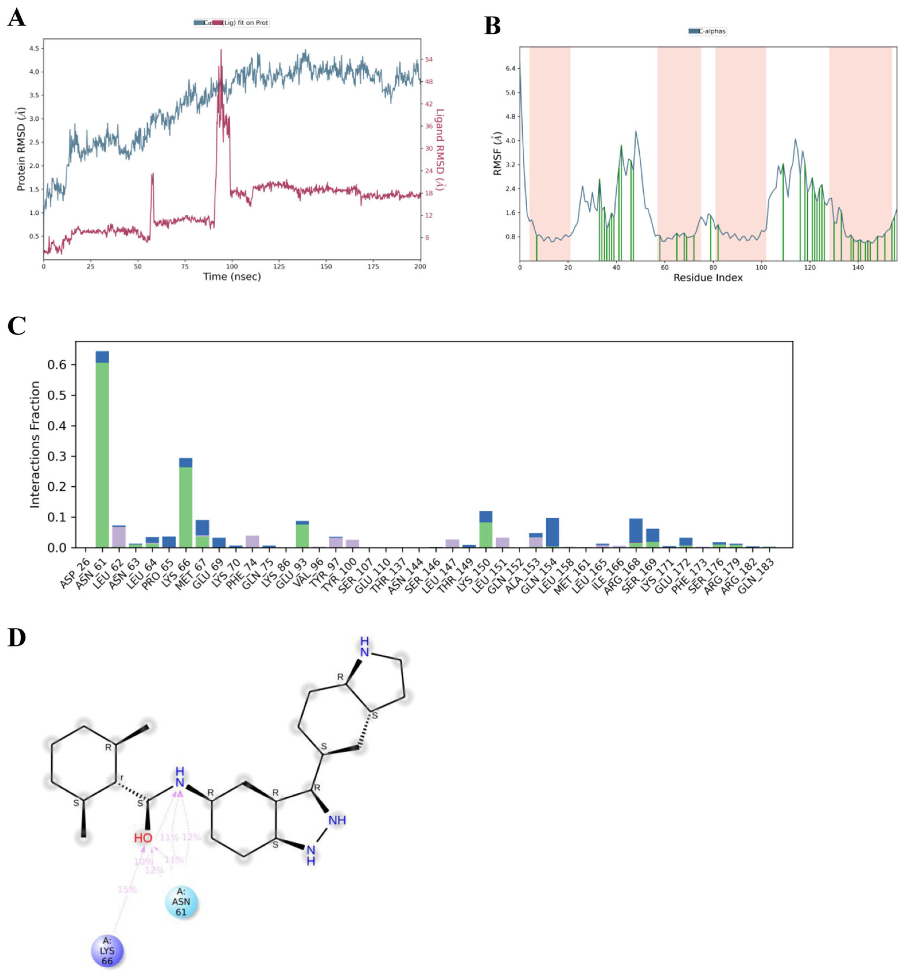 | IL-6 | Hydrogen bond | ASN61, GLU172, LEU62, LYS66 | 1.86, 1.71/2.32, 1.87, 3.48 | GLU172, LYS66 |