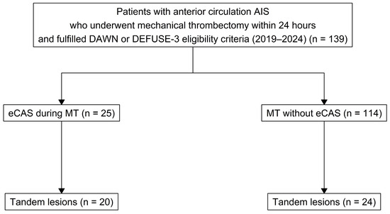 This retrospective observational cohort study was conducted at a single-center to evaluate the effectiveness of eCAS in patients with AIS undergoing MT within an extended time window according to the DAWN and DEFUSE-3 criteria. The study included consecutive AIS patients admitted to the Stroke Unit of the Department of Adult Neurology at the University Clinical Center in Gdansk between 2019 and 2024, identified through the hospital’s information system. Patients were categorized into two groups based on whether they underwent eCAS during MT: the eCAS group and the non-stenting group. The primary objective was to compare functional and safety outcomes between these groups, focusing on the risk of hemorrhagic transformation (HT) after eCAS and the additional use of antithrombotic medications during the procedure.