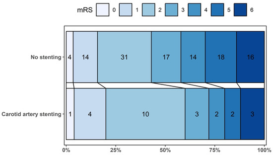 The study included 25 patients who underwent emergent carotid artery stenting (eCAS) (24 of these also had angioplasty before stent placement) and 114 patients in the non-stenting cohort (Figure 1). The median age (Q1–Q3) was 69 (62–76) years, with 68 (48.9%) female patients in the overall cohort. Patients in the eCAS group had a significantly higher frequency of tandem occlusion (80% vs. 21.1%, p < 0.001) and atherosclerosis (88% vs. 17.5%, p < 0.001) compared to the non-stenting group. The median baseline NIHSS (Q1–Q3) was similar between the groups (14 (10–19) vs. 15.5 (12–19), p = 0.358), as was the time to treatment (14.1 (12.9–17.2) vs. 12.6 (10.3–15.5), p = 0.139) (Table 1).