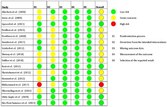 Each domain was rated as low risk of bias, high risk of bias, and some concerns. As specified in the Cochrane Handbook for Systematic Reviews to assess the risk of bias [19], if we determine that any of the domains has a high risk of bias in a trial, then the overall risk of bias is considered high. Any disagreements were resolved by consensus.