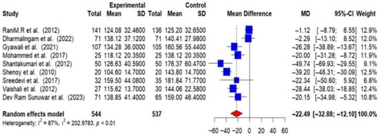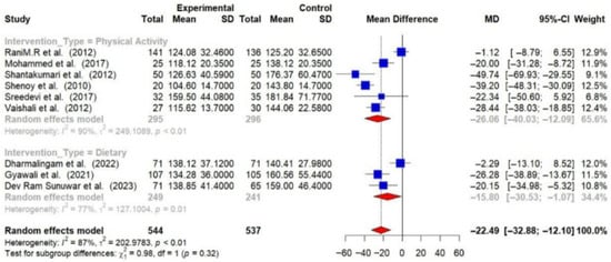 Out of 16 RCTs, 9 provided post-intervention data on FBG among T2DM patients. Using a random-effects meta-analysis, the post-intervention pooled MD in FBG levels between intervention and control groups was found to be −22.49 mg/dL (95% CI: −32.88 to −12.10), indicating that lifestyle modifications effectively lower FBG levels (p < 0.01). A substantial level of heterogeneity was observed among the studies (I2 = 87%), suggesting that the effectiveness of the interventions varied across different studies [Figure 5].
