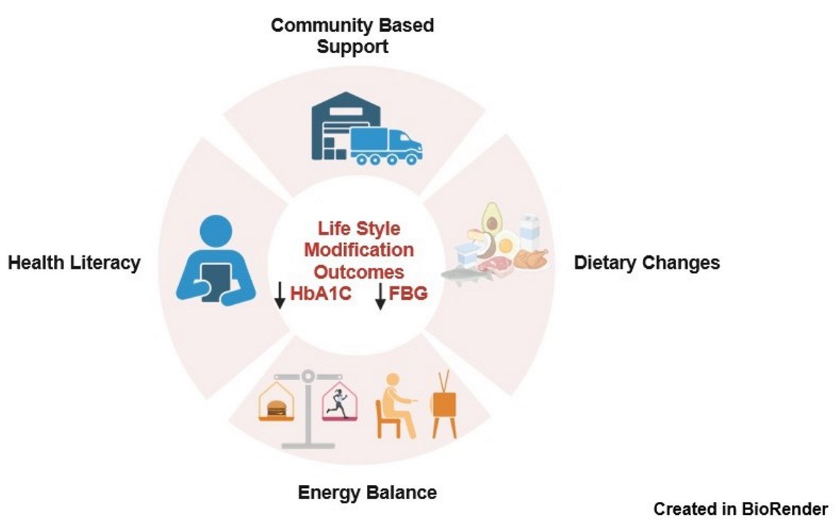 | 7 | Pardhan et al. (2023) [38] | Pokhara, Nepal | 3 months | n = 55 | 45 | n = 55 | 47 | Combined: Culturally appropriate video education, customized diet, and exercise plan | Usual Care | HbA1c | Some Concerns |