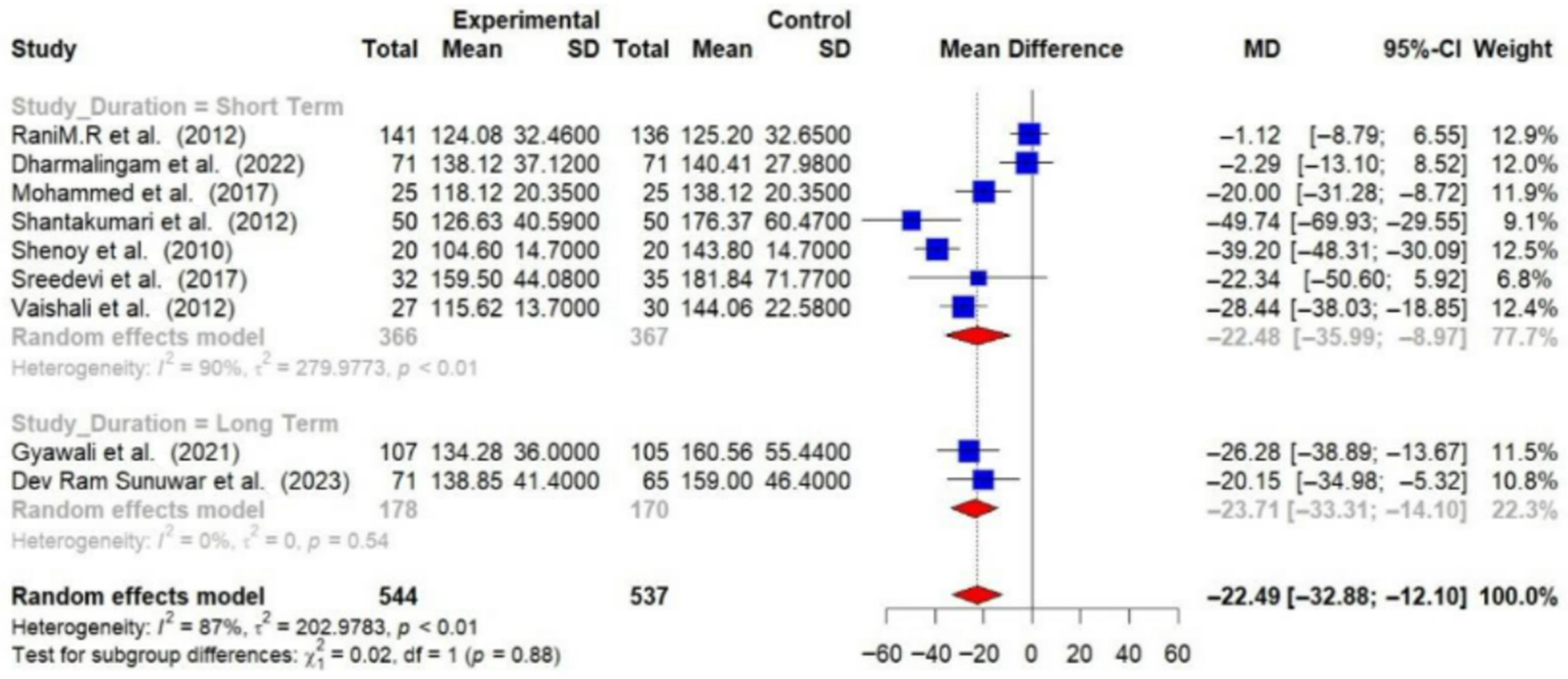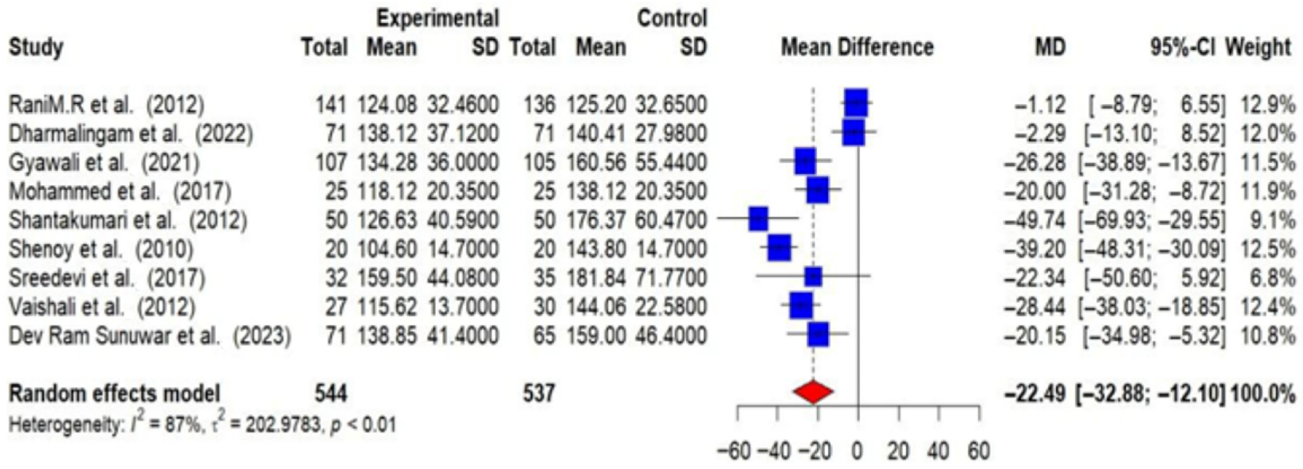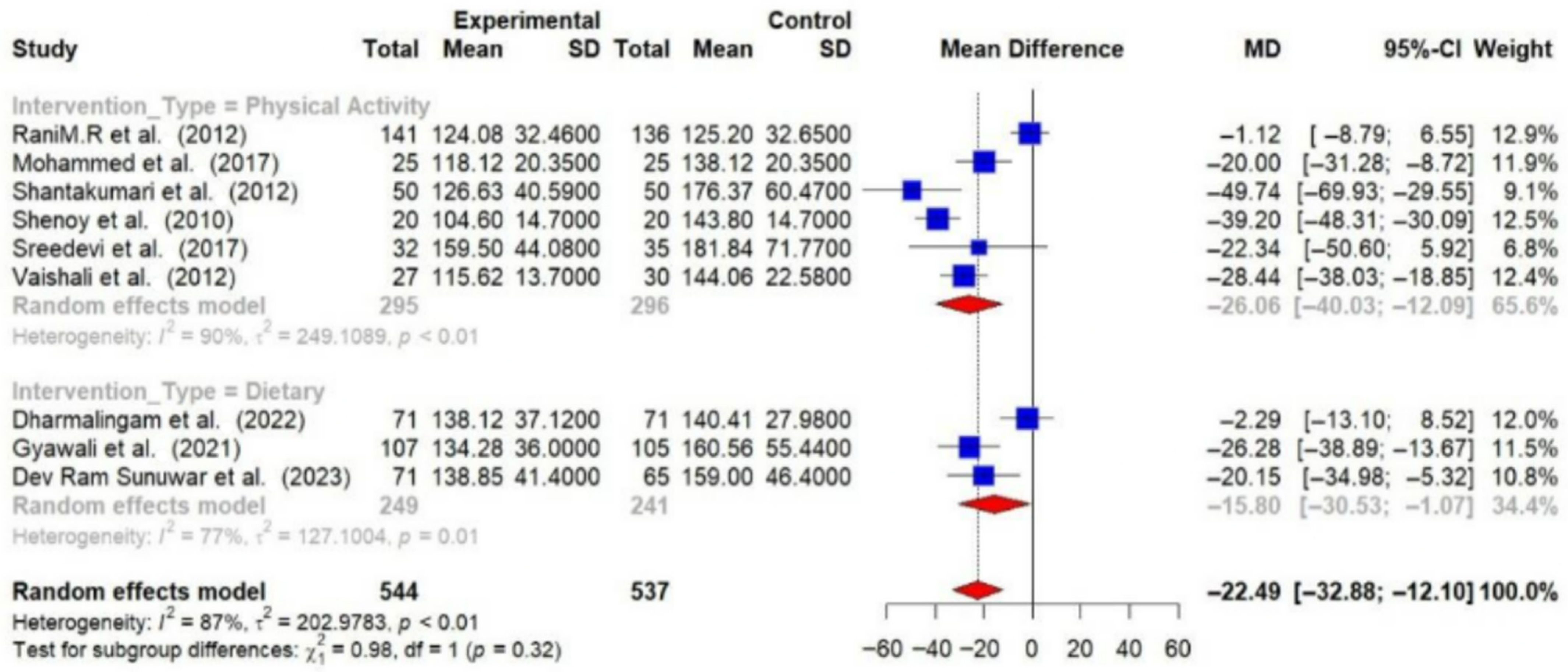 | 10 | Shantakumari et al. (2012) [27] | Trivandrum, Kerala, India | 3 months | n = 50 | 45.51 | n = 50 | 44.46 | Physical Activity: Yoga | Usual care | FBS, | Some Concerns |