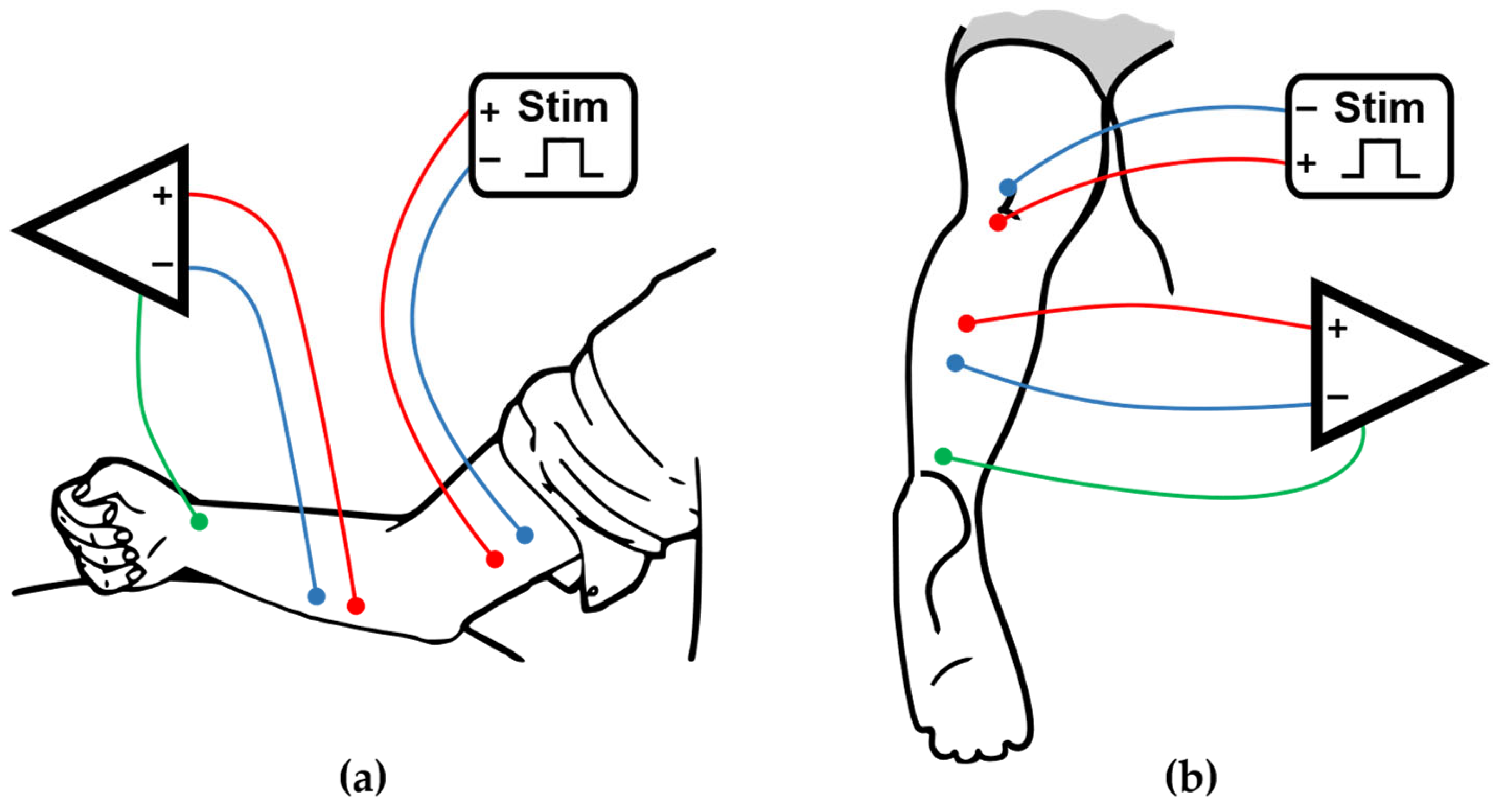 Bilateral H-reflexes were recorded from the flexor carpi radialis (FCR) in the upper limbs and the soleus muscle in the lower limbs. Ag/AgCl surface electrodes were positioned in a belly-tendon montage for both muscle groups to record EMG signals. Stimulation was delivered via a constant-current stimulator delivering monopolar 1 ms square-wave pulses through stainless-steel surface electrodes (10 mm in diameter), with the cathode placed proximally.
