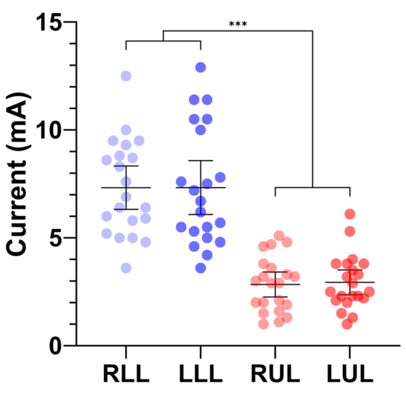 The stimulation current required to elicit the target H-reflex amplitude was significantly lower in the upper limbs (7.3 ± 2.2, right; 7.3 ± 2.7, left) compared with the lower limbs (2.8 ± 1.3, right; 2.9 ± 1.3, left), with a mean difference of 4.4 ± 2.2 mA (