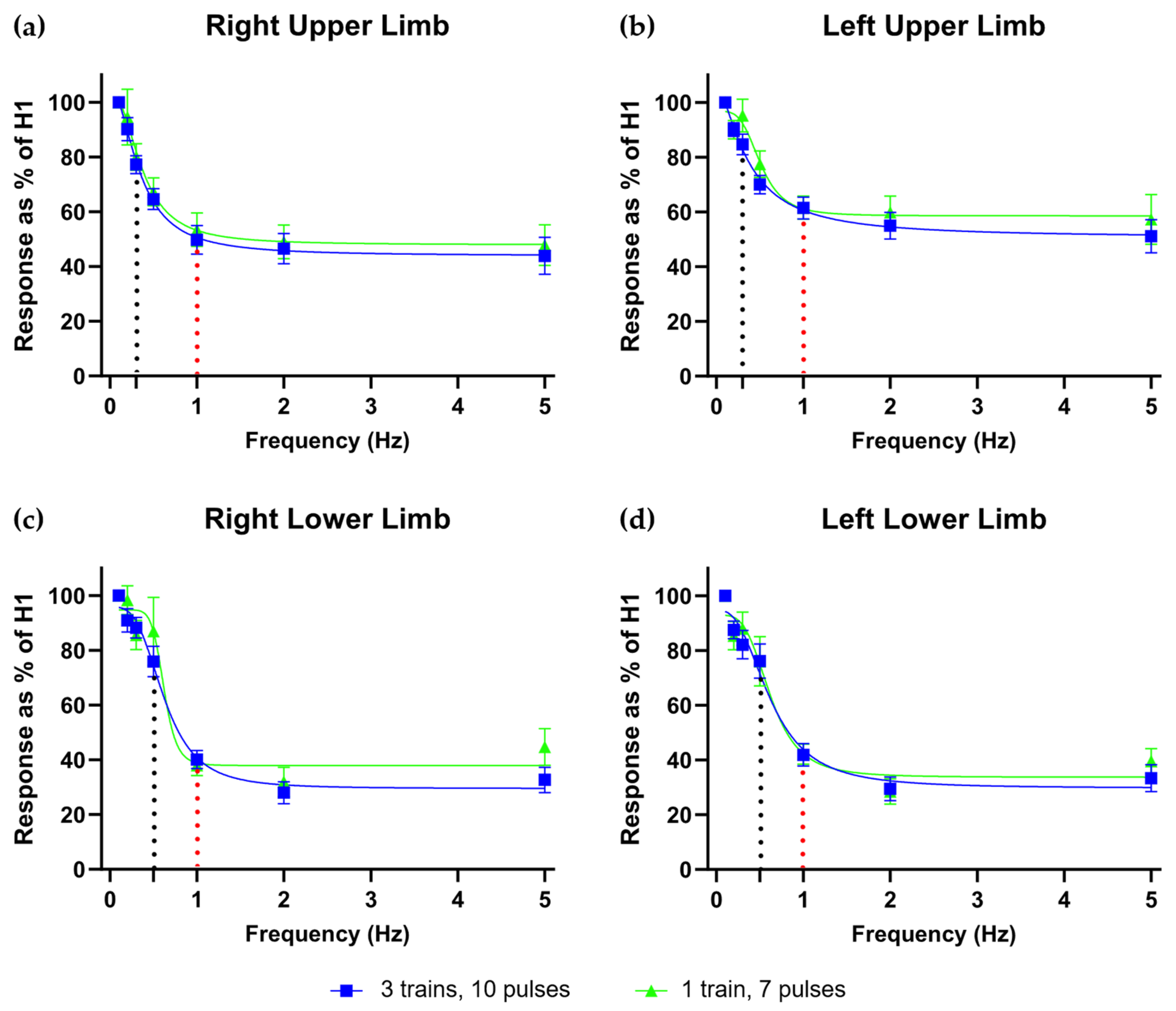 50) of the sigmoidal curve was similar across both upper limbs (approximately 0.35 Hz) but shifted slightly higher in the lower limbs (approximately 0.6 Hz), indicating that higher stimulation frequencies may be needed to achieve comparable depression in the lower extremities. These findings are consistent with previous reports in the soleus muscle [