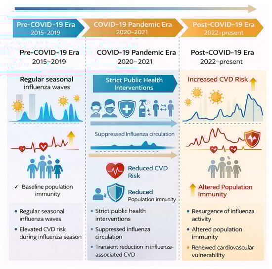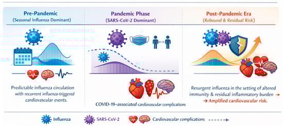Conceptual framework illustrating the evolving relationship among seasonal influenza, COVID-19, and cardiovascular complications across the pre-pandemic, pandemic, and post-pandemic eras. In the pre-pandemic period, predictable seasonal influenza circulation is associated with recurrent influenza-triggered cardiovascular events. During the COVID-19 pandemic, although non-pharmaceutical interventions markedly suppressed influenza transmission, SARS-CoV-2 infection independently contributed to cardiovascular complications, including myocardial injury, myocarditis, thromboembolic events, arrhythmias, and stroke, as indicated by dedicated cardiovascular icon annotations. In the post-pandemic era, the resurgence of influenza amid altered population immunity and residual inflammatory burden is associated with renewed and potentially amplified cardiovascular risk.