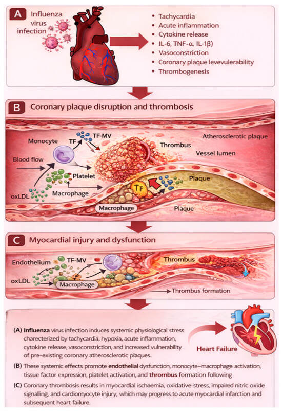 Influenza infection triggers a robust inflammatory response, leading to the release of interleukin-6 (IL-6) and tumor necrosis factor-α (TNF-α), which contribute to endothelial dysfunction, plaque destabilization, and a hypercoagulable state that predisposes to acute coronary syndromes and cardiovascular mortality [37,45,47]. In addition, fever-induced tachycardia and increased myocardial oxygen demand further exacerbate myocardial ischemia in patients with limited coronary reserve [45,48]. Furthermore, several studies have shown that viral infections can induce arrhythmias and worsen the heart’s ability to pump blood in already susceptible patients.