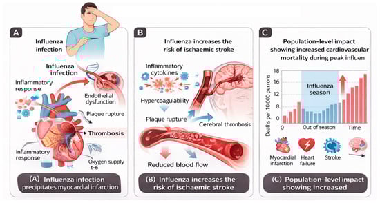 Cardiovascular complications of influenza infection. (A) Acute influenza infection precipitates myocardial infarction through systemic inflammation, endothelial dysfunction, plaque destabilisation, and thrombosis. (B) Influenza infection increases the risk of ischaemic stroke via inflammatory cytokine release, endothelial injury, and hypercoagulable states, leading to cerebral thrombosis. (C) Population-level impact of influenza infection showing increased cardiovascular mortality during peak influenza activity, driven by excess myocardial infarction, heart failure exacerbations, and stroke. Proposed mechanisms are derived from observational human studies and experimental data and should not be interpreted as definitive causal pathways.