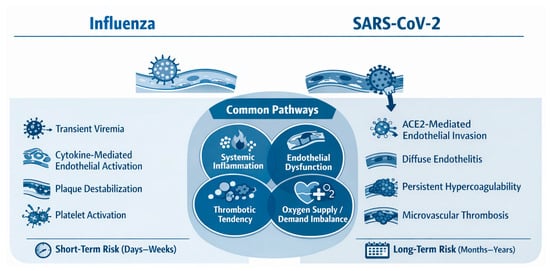Both the influenza virus and SARS-CoV-2 trigger systemic inflammation, endothelial dysfunction, and pro-thrombotic states that predispose to acute cardiovascular events. Influenza is typically associated with transient immune activation and short-term cardiovascular risk, whereas SARS-CoV-2 often causes direct endothelial injury, sustained hypercoagulability, and prolonged cardiovascular sequelae that extend beyond the acute infection period.