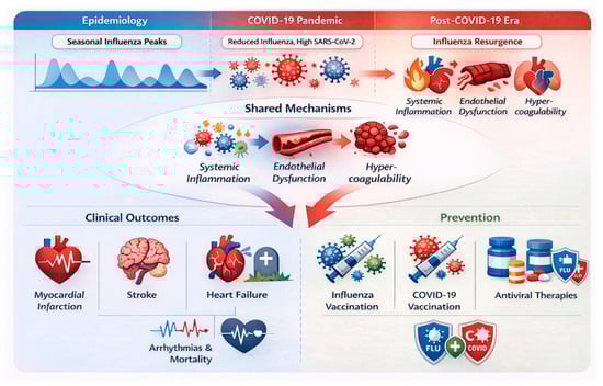 The organization of this paper is as follows. Section 2 outlines the methods and literature search strategy. Section 3 examines the epidemiology and pathophysiological mechanisms linking seasonal influenza to cardiovascular complications, including myocardial infarction, stroke, heart failure, and cardiovascular mortality. Section 4 specifically addresses the impact of the COVID-19 pandemic on influenza epidemiology and cardiovascular disease, including changes in transmission patterns, long-term cardiac sequelae of SARS-CoV-2 infection, co-infection with influenza, and vaccination-related cardiovascular implications in the post-COVID era. Section 5 discusses the long-term cardiovascular consequences of influenza and COVID-19, including post-viral syndromes and comparative outcomes. Section 6 summarises key findings, clinical and public health implications, research gaps, and future directions.