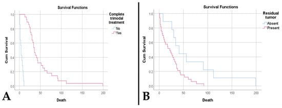 (A). Kaplan–Meier survival plot shows a lower survival rate for patients who did not receive the complete trimodality treatment (p < 0.001). (B). Kaplan–Meier survival plot shows a lower survival rate for patients who had residual tumor (p = 0.017).