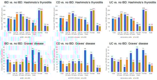 Figure 2. Incidence rates of Hashimoto’s thyroiditis and Graves’ disease in patients with and without IBD (per 100,000 person-years).