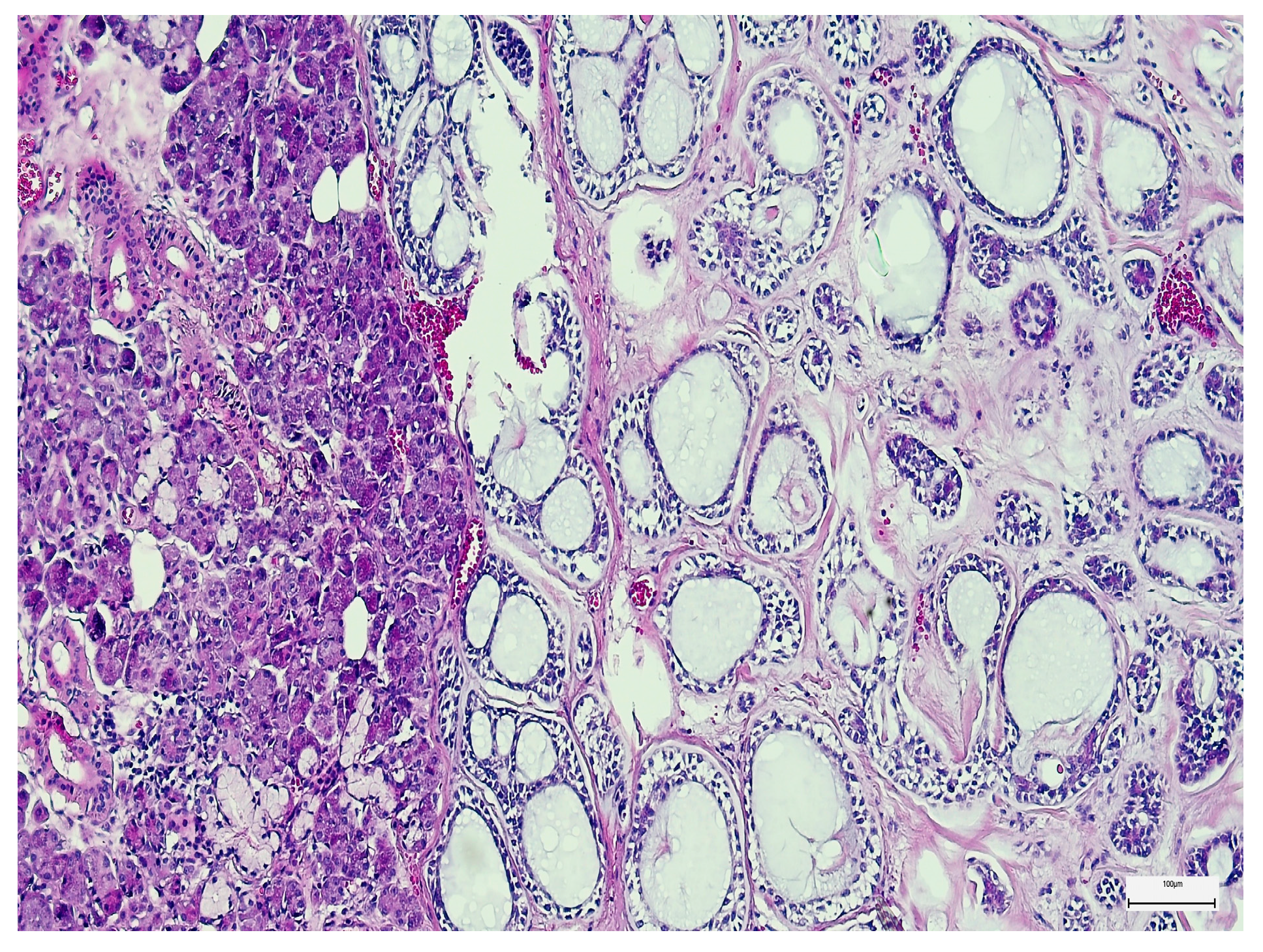 - Rajbhar, R.; Ekatpure, D.; Kolhe, A. Comprehensive Five-Year Study on Salivary Gland Tumors: Demographic, Clinical, and Histopathological Insights. Adv. Oral Maxillofac. Surg. 2025, 17, 100523. [Google Scholar] [CrossRef]