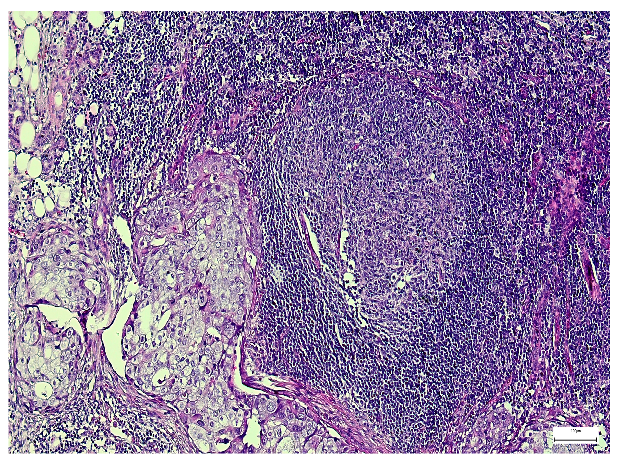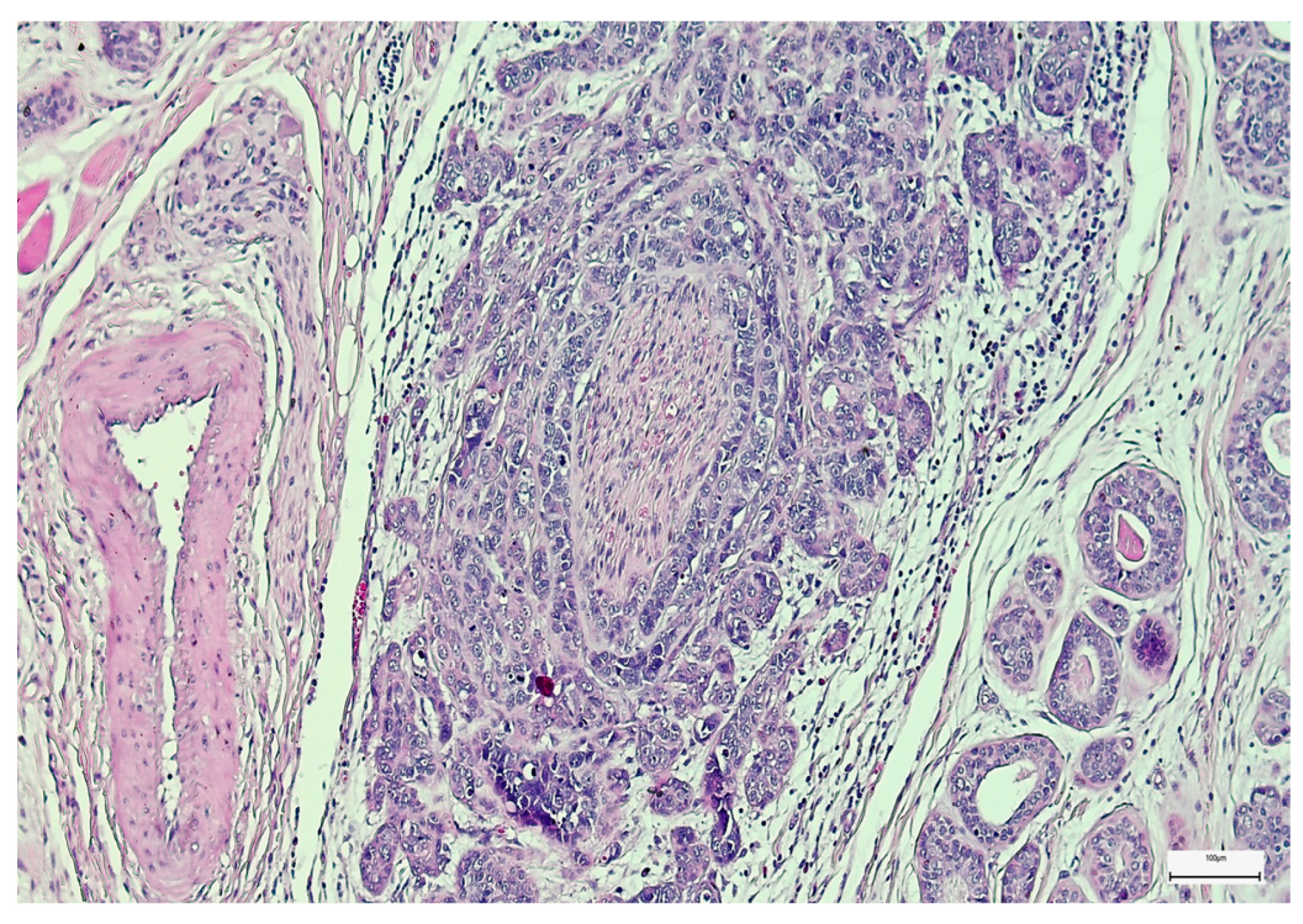 - Park, Y.M.; AlHashim, M.A.; Yoon, S.O.; Koh, Y.W.; Kim, S.H.; Lim, J.Y.; Cho, E.C. Prognostic significance of lymphovascular invasion in patients with salivary duct cell carcinoma of the head and neck. Int. J. Oral Maxillofac. Surg. 2020, 49, 693–699. [Google Scholar] [CrossRef]