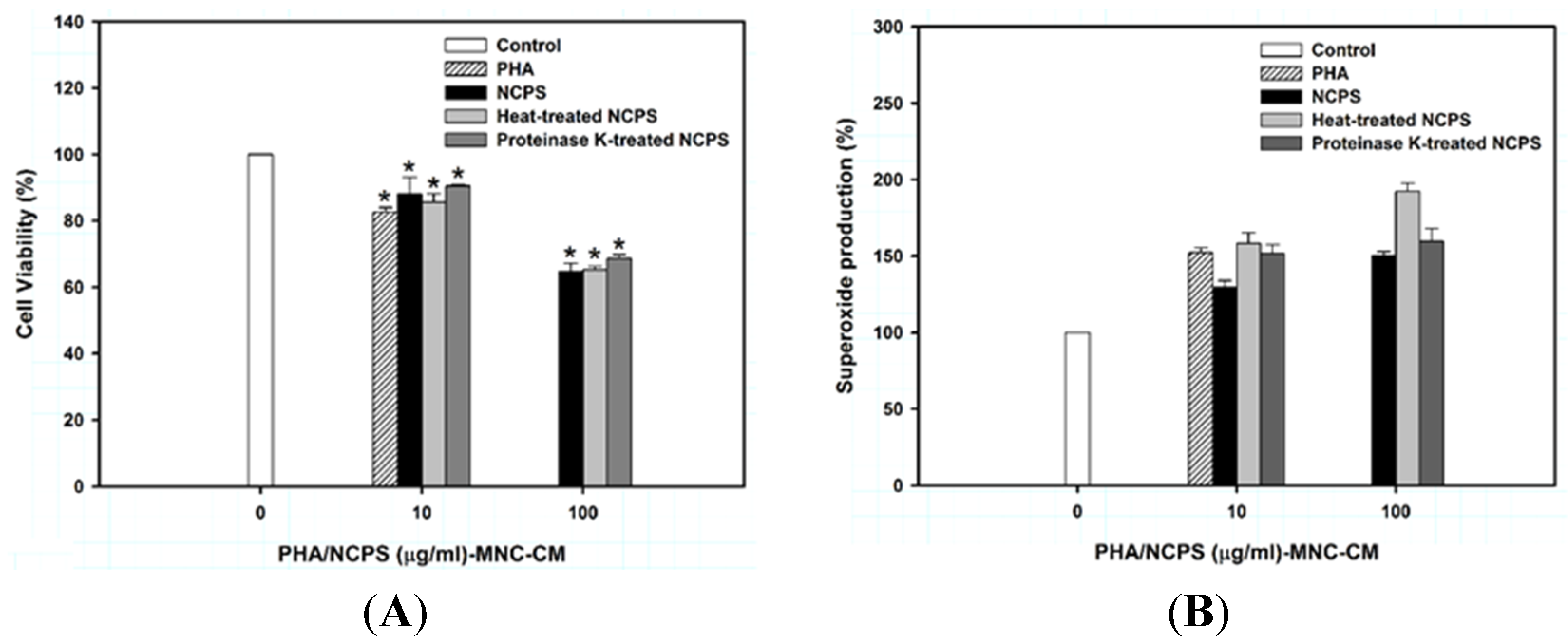 Cell viability (A) and superoxide production (B) of U937 cells upon treatment with MNC-CMs for three days. PHA was used as the positive control. * indicates that there is a statistically significant difference between control and treatment groups (p < 0.05).