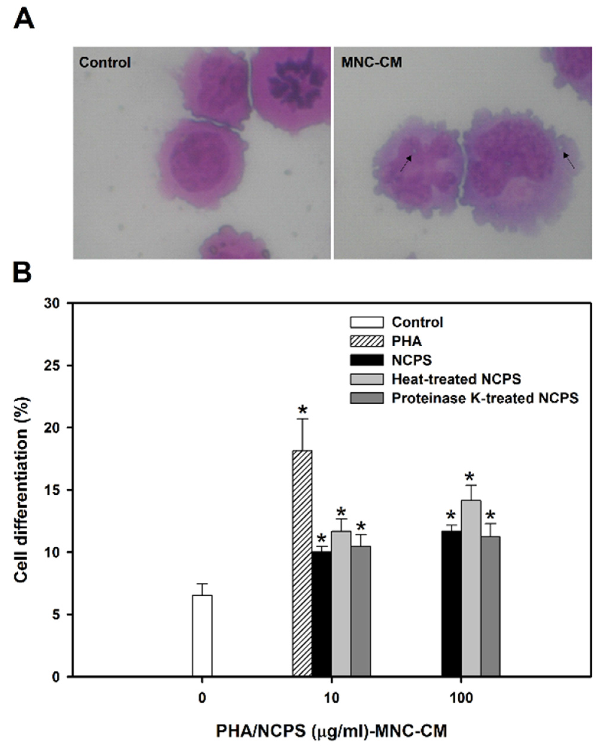 As shown in Figure 2A, the prepared MNC-CMs significantly triggered differentiation of U937 cells into mature monocytes. The morphology of monocytes includes the increase of cytosol/nuclear ratio, expression of vacuoles in cytosol and formation of pseudopods in cell membrane. The percentage of mature monocytes was significantly increased from 6.54% ± 0.91% (untreated control) to 10.03% ± 0.44%, 11.68% ± 0.99% and 10.47% ± 0.96% by MNC-CM prepared with NCPS, heat-treated NCPS and proteinase K-treated NCPS, respectively (Figure 2B). The experimental results clearly indicate that NCPS-MNC-CM can stimulate U937 cells toward monocytic differentiation. Moreover, the stimulation seemed to be a dose-independent event due to there being no significant difference in the percentage of mature monocytes between concentrations 10 and 100 μg/mL.
