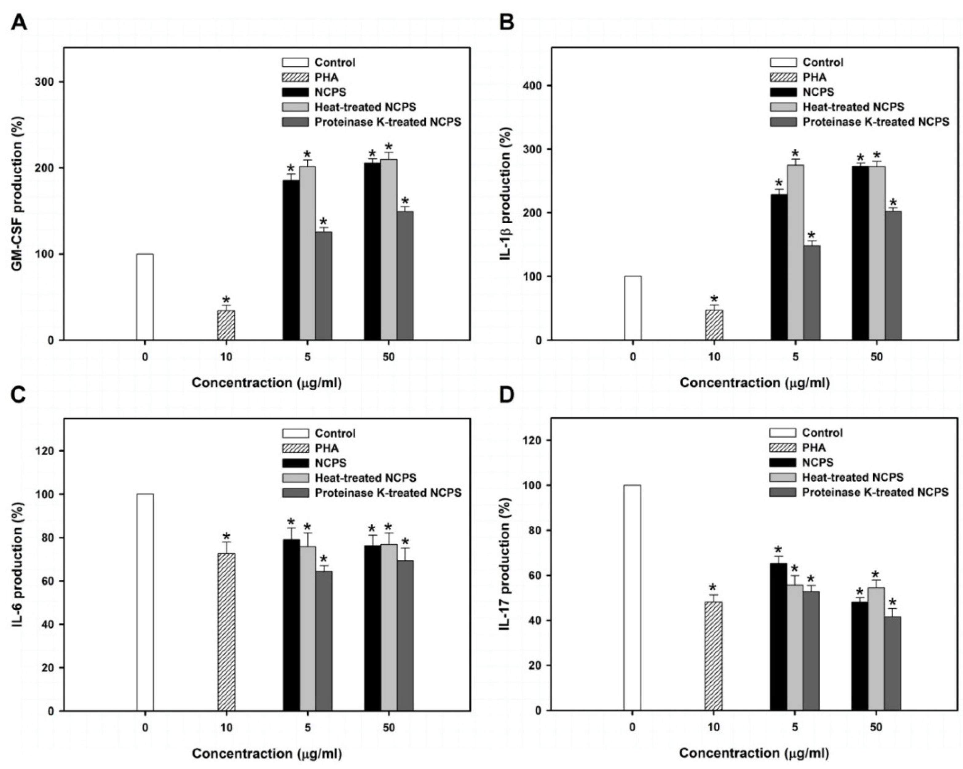 Levels of GM-CSF (A), IL-1β (B), IL-6 (C), and IL-17 (D) in MNC-CMs that were produced from MNC with the treatment of PHA, NCPS, heat-treated NCPS, and proteinase K-treated NCPS. Star indicates that there is a statistically significant difference between control and treatment groups (p < 0.05).