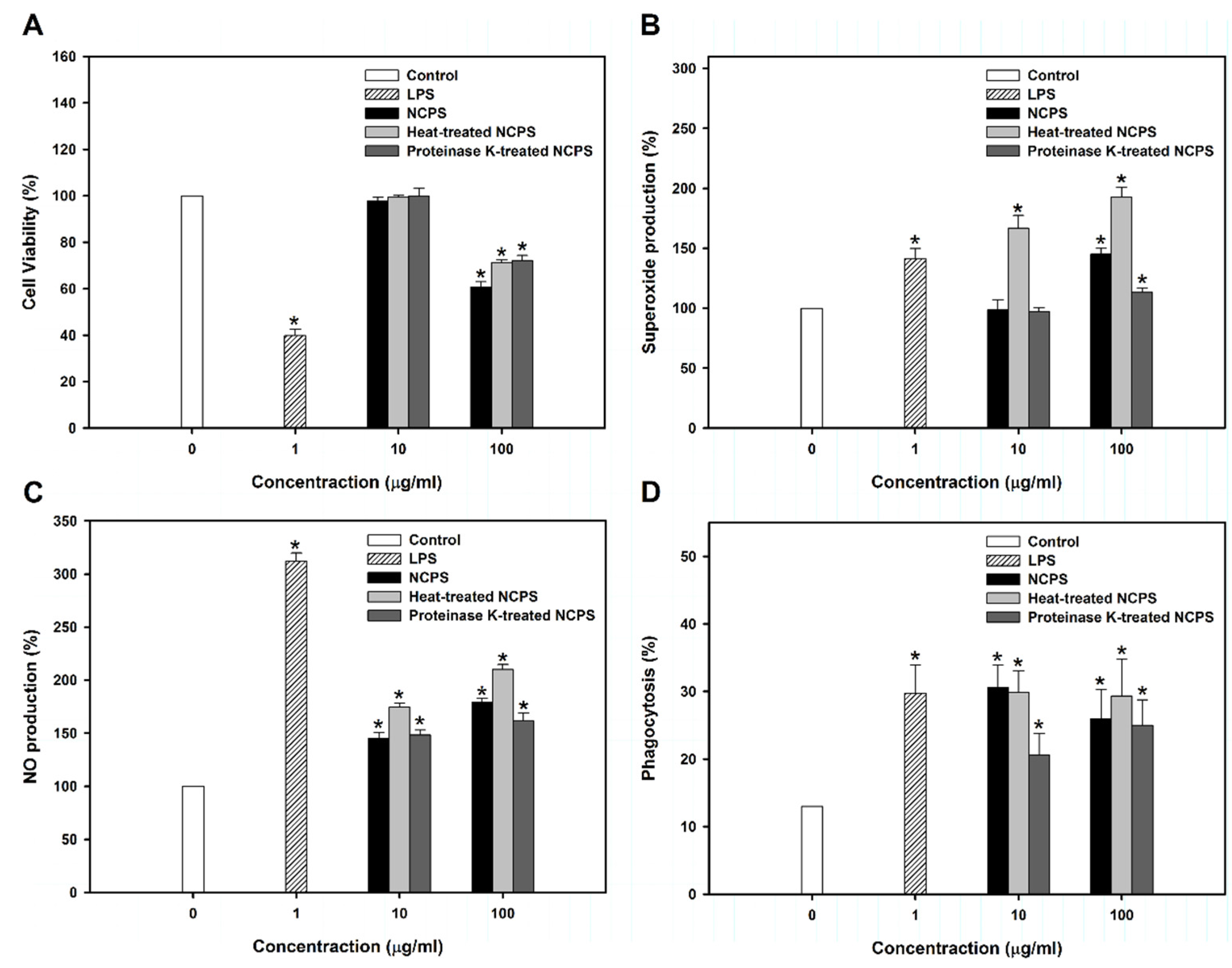 Cell viability (A), superoxide production (B), nitric oxide synthesis (C), and phagocytosis (D) of RAW264.7 cells upon treatment with NCPS for two days. * indicates that there is a statistically significant difference between control and treatment groups (p < 0.05).
