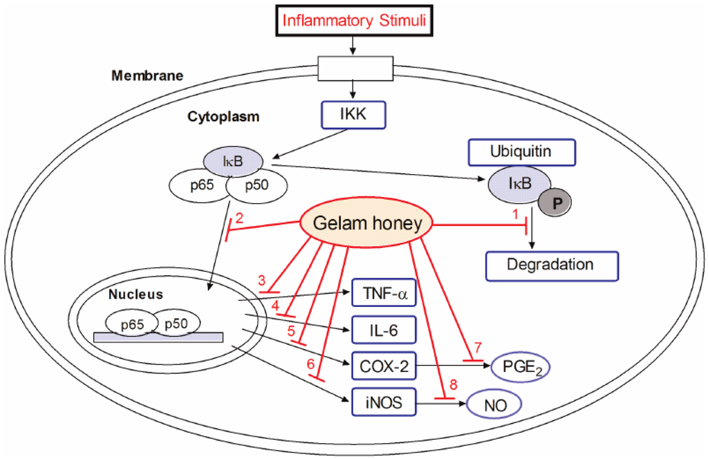 Hussein et al. [43] conducted another study to examine the inhibition of GH against inflammation. Pretreatment with GH for 1 or 7 days, at a concentration of either 1 or 2 g/kg body weight, reduced the formation of paw edema significantly in a dose-dependent manner (p < 0.05). Plasma NO level increased in those inflammation-induced rats. However, oral feeding of GH at either dose significantly reduced the NO levels in rats with carrageenan-induced inflammation. The effect of 2 g/kg of body weight of honey administration was similar to that of the NSAID Indomethacin given at a dose of 10 mg/kg of body weight. In addition, GH significantly inhibited PGE2 production in both 1- and 7-day models. Plasma TNF-α and IL-6 were determined using ELISA, showing a decrease in the production of plasma TNF-α and IL-6. The effect of pretreatment at 2 g/kg body weight for 7 days was comparable to the effect of the NSAID Indomethacin. Real-time polymerase chain reaction (RT-PCR) and Western blot analysis were performed to evaluate the effect of GH on the expression of inflammatory-related enzymes (iNOS and COX-2), and pro-inflammatory cytokines (TNF-α and IL-6) genes and proteins in paw edema. GH at either dose significantly suppressed the gene expression of pro-inflammatory mediators (p < 0.05). Western blot analysis demonstrated that GH inhibited the protein expression of iNOS, COX-2, IL-6, and TNF-α in rat paw tissue in a dose-dependent manner.
