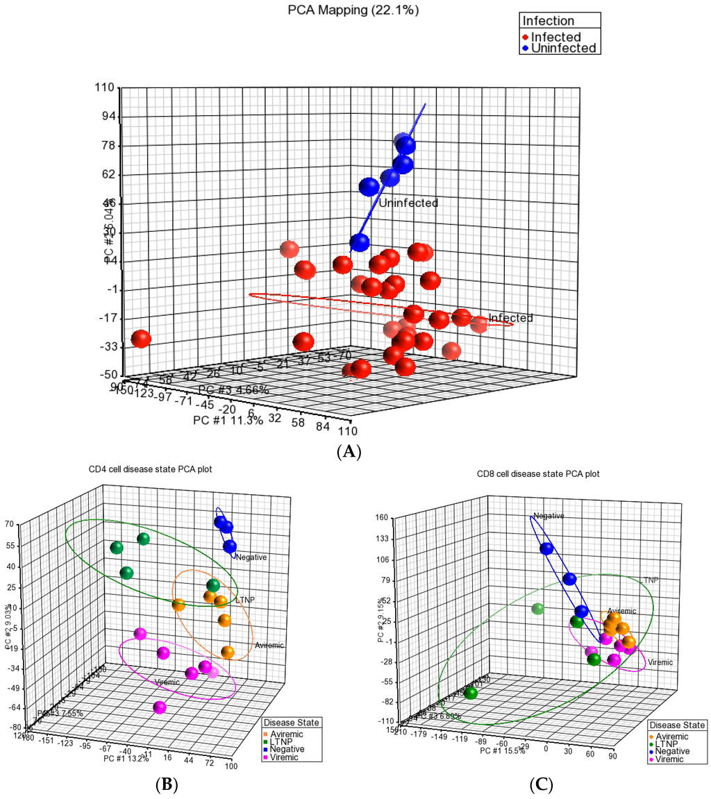 (A) Principal component analysis (PCA) of samples highlighting concordance and clustering of all infected cell samples, compared to uninfected samples. X Axis (Component 1) = 11.3%, Y Axis (Component 2) = 6.04%, Z Axis (Component 3) = 4.66%. Red = HIV-positive (HIV+), Blue = HIV-negative (HIV–), healthy donors; PCA of CD4+ (B) and CD8+ (C) T-cells respectively, highlighting disease group concordance. Pink = viremic, Yellow = aviremic, Green = LTNP, Blue = negative. Viremic n = 6, aviremic n = 5, LTNP n = 4, negative n = 3 for each cell type. (B) X axis (Component 1) = 13.2%, Y axis (Component 2) = 9.03%, Z axis (Component 3) = 7.55%. (C) X axis (Component 1) = 15.5%, Y axis (Component 2) = 9.15%, Z axis (Component 3) = 6.89%.