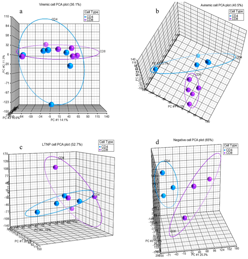 The underlying reasons for this distinction between CD4+ and CD8+ T-cells in their ability to segregate HIV disease and non-disease groups remain unclear. PCA was also used to determine cell specificity in relation to disease group by directly comparing the CD4+ and CD8+ T-cells of each disease state. This analysis indicated a clear segregation of CD4+ and CD8+ T-cell type based on disease state, implying cell-specific functional segregation during HIV disease stages (Figure 2a–c) and in a healthy state, as can be seen in Figure 2d. Although good segregation of CD4+ and CD8+ T-cells was seen based on disease group for viremic (a), aviremic (b), and negative (d) comparisons, the data shown for the LTNPs in Figure 2c show a close relationship and little segregation between CD4+ and CD8+ T-cells, suggesting a possible functional significance of CD4+ and CD8+ T-cells and cooperation between them in mounting sustained response during natural control of HIV in the LTNPs.